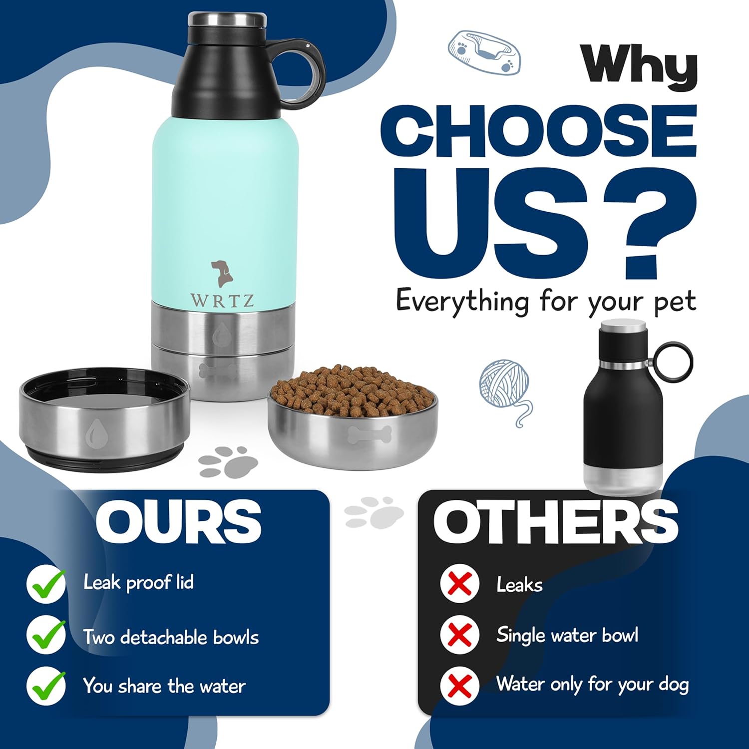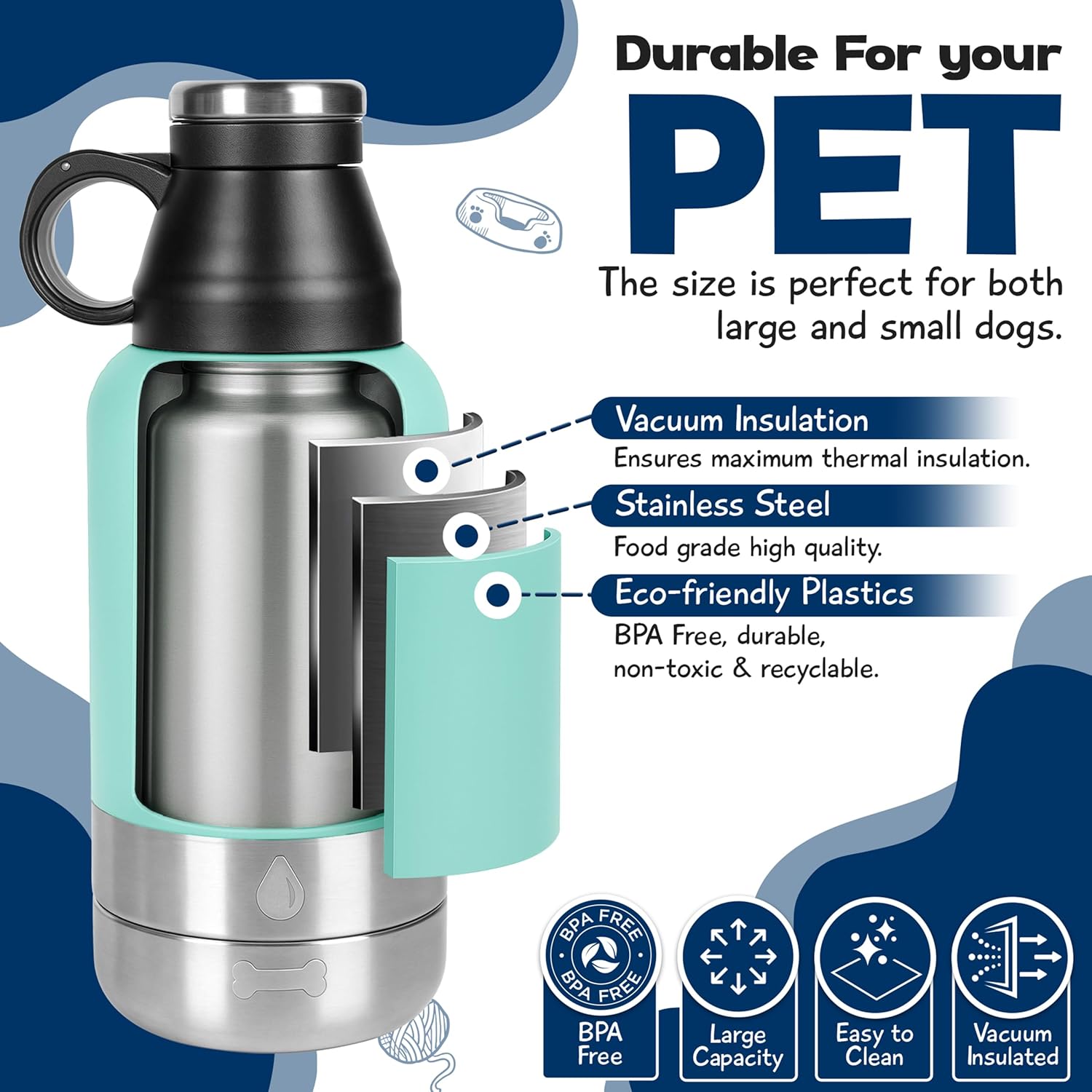 <br> Package Dimensions : 11.06 x 4.57 x 4.41 inches; 1.48 Pounds <br> Item model number : Insulated Stainless Steel Dog Bottle <br> Date First Available : November 18, 2024 <br> Manufacturer : WRTZ <br> ASIN : B0DNGJTSY5 <br> Best Sellers Rank: #40,194 in Pet Supplies (See Top 100 in Pet Supplies) #55 in Dog Water Bottles <br> Customer Reviews: 4.9 4.9 out of 5 stars 156 ratings var dpAcrHasRegisteredArcLinkClickAction; P.when('A', 'ready').execute(function(A) { if (dpAcrHasRegisteredArcLinkClickAction !== true) { dpAcrHasRegisteredArcLinkClickAction = true; A.declarative( 'acrLink-click-metrics', 'click', { "allowLinkDefault": true }, function (event) { if (window.ue) { ue.count("acrLinkClickCount", (ue.count("acrLinkClickCount") || 0) + 1); } } ); } }); P.when('A', 'cf').execute(function(A) { A.declarative('acrStarsLink-click-metrics', 'click', { "allowLinkDefault" : true }, function(event){ if(window.ue) { ue.count("acrStarsLinkWithPopoverClickCount", (ue.count("acrStarsLinkWithPopoverClickCount") || 0) + 1); } }); }); <br>Perfect Size for Small & Medium Dogs: The 32oz capacity is ideal for small and medium-sized dogs, providing ample water for daily walks, trips, and outings.<br>Durable Construction: Made from high-quality, food-grade stainless steel, ensuring long-lasting durability and resistance to dents, rust, and corrosion.<br>Portable and Lightweight: Easy to carry on hikes, car trips, and other adventures, making it convenient for both you and your dog.<br>Leak-Proof Design: Equipped with a secure, leak-proof cap to prevent spills and maintain the temperature of your beverage.<br>Easy to Clean: Bottle is dishwasher safe, simplifying maintenance and hygiene. The bowls are lined with BPA-free food grade plastic.