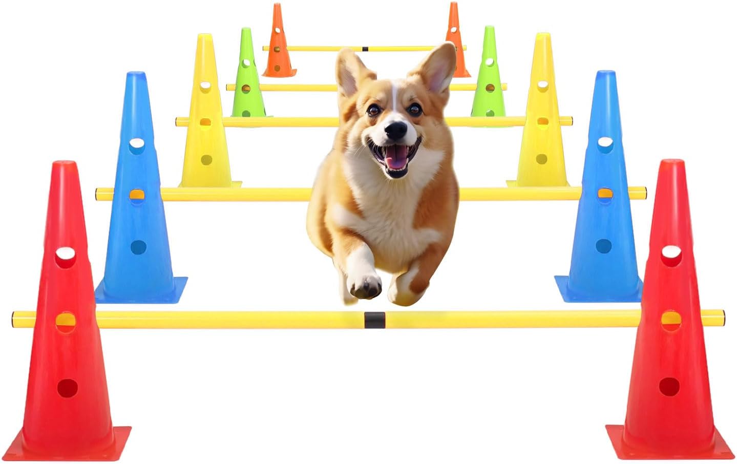<br> Product Dimensions : 5 x 5 x 19 inches; 7.55 Pounds <br> Item model number : DogAgilityJump1119 <br> Date First Available : April 1, 2025 <br> Manufacturer : plzzree <br> ASIN : B0F3736MWK <br> Best Sellers Rank: #153,657 in Pet Supplies (See Top 100 in Pet Supplies) #114 in Dog Agility Jumps <br> Customer Reviews: 4.6 4.6 out of 5 stars 3 ratings var dpAcrHasRegisteredArcLinkClickAction; P.when('A', 'ready').execute(function(A) { if (dpAcrHasRegisteredArcLinkClickAction !== true) { dpAcrHasRegisteredArcLinkClickAction = true; A.declarative( 'acrLink-click-metrics', 'click', { "allowLinkDefault": true }, function (event) { if (window.ue) { ue.count("acrLinkClickCount", (ue.count("acrLinkClickCount") || 0) + 1); } } ); } }); P.when('A', 'cf').execute(function(A) { A.declarative('acrStarsLink-click-metrics', 'click', { "allowLinkDefault" : true }, function(event){ if(window.ue) { ue.count("acrStarsLinkWithPopoverClickCount", (ue.count("acrStarsLinkWithPopoverClickCount") || 0) + 1); } }); }); <br>Dog Agility Jumps: Our dog agility course backyard set includes 1 black net bag, 10 cones and 5 detachable poles, you can change the cone and pole settings to meet a variety of training needs. The cone is 18.9 inches tall and each rod has a total length of 41 inches.<br>Dog Jumping Hurdles: This agility training equipment for dogs, use 5 colors cones and yellow poles combo that are easier to attract distracted puppies' attention, and you can create multi challenging and engaging obstacle courses that ensures an effective pet agility training course.<br>Dog Agility Equipment: Our dog agility jumps cones and poles are made of high quality plastic with a smooth, hard surface that can stand firmly on the ground and effectively withstand the bite of naughty puppies.<br>Dog Agility Equipment: Our dog agility jumps cones and poles are made of high quality plastic with a smooth, hard surface that can stand firmly on the ground and effectively withstand the bite of naughty puppies.<br>Dog Agility Training: This dog agility equipment is suitable for a variety of uses. Whether you're training your dog for agility competitions, obedience exercises, or just getting them to actively play, this kit offers endless possibilities. It can be used both indoors and outdoors, suitable for various training environments.