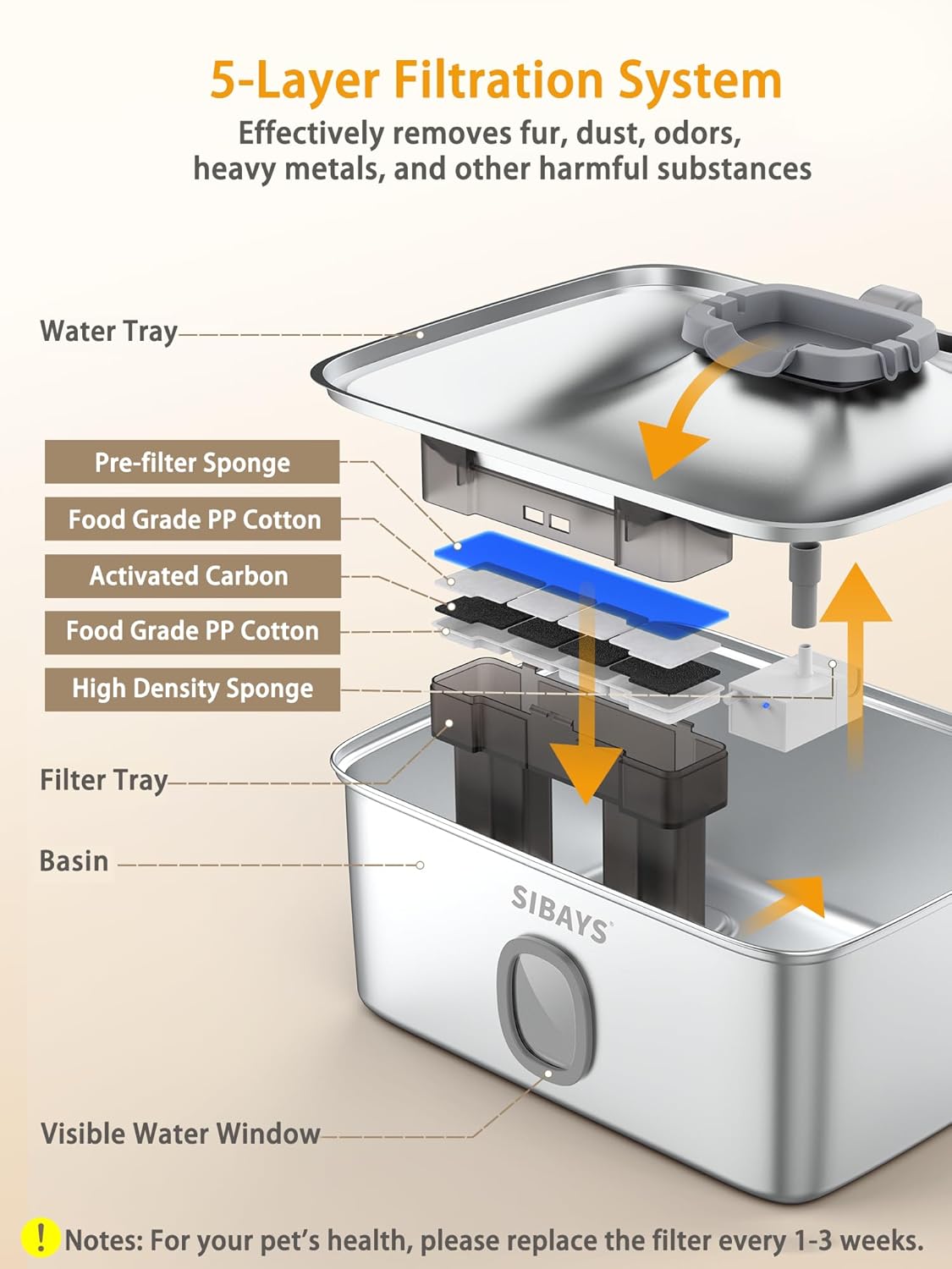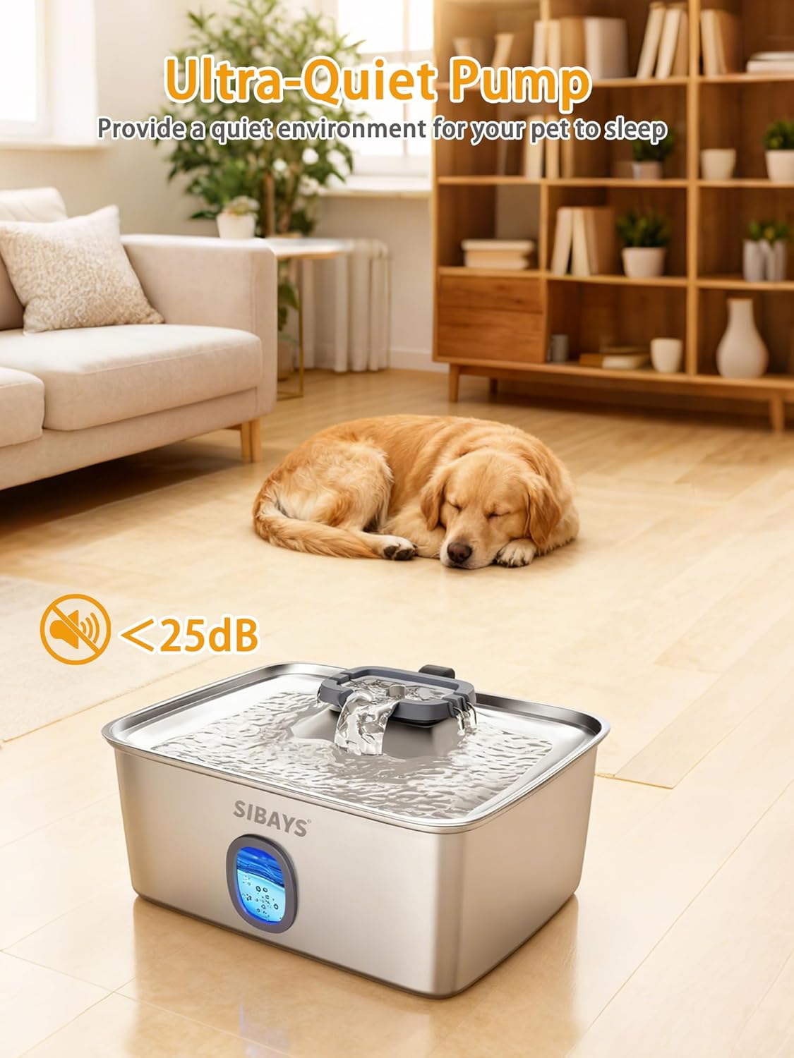 <br> Product Dimensions : 14.5 x 11.5 x 6.1 inches; 4.6 Pounds <br> Item model number : FS76 <br> Date First Available : April 16, 2025 <br> Manufacturer : SIBAYS <br> ASIN : B0DXPTTKW2 <br> Best Sellers Rank: #13,735 in Pet Supplies (See Top 100 in Pet Supplies) #49 in Dog Fountains #231 in Cat Fountains <br> Customer Reviews: 4.4 4.4 out of 5 stars 171 ratings var dpAcrHasRegisteredArcLinkClickAction; P.when('A', 'ready').execute(function(A) { if (dpAcrHasRegisteredArcLinkClickAction !== true) { dpAcrHasRegisteredArcLinkClickAction = true; A.declarative( 'acrLink-click-metrics', 'click', { "allowLinkDefault": true }, function (event) { if (window.ue) { ue.count("acrLinkClickCount", (ue.count("acrLinkClickCount") || 0) + 1); } } ); } }); P.when('A', 'cf').execute(function(A) { A.declarative('acrStarsLink-click-metrics', 'click', { "allowLinkDefault" : true }, function(event){ if(window.ue) { ue.count("acrStarsLinkWithPopoverClickCount", (ue.count("acrStarsLinkWithPopoverClickCount") || 0) + 1); } }); }); <br>4Gal/15L Extra Large Capacity: Say goodbye to constant refills with our large pet water fountain! Our dog water fountain for large dogs has 4Gal/15L huge capacity, which meets the water needs of multi-pet for 10-15 days, reducing the frequency of water replenishment. Ideal for large dogs, multi-pet households.<br>304 Stainless Steel Material: The large dog water fountain is made of high-quality SUS304 stainless steel, which is safe, durable, rust, and corrosion-proof. The water fountain for dogs is more durable and healthier than plastic, it helps prevent chin acne, and provide pets with cooler, cleaner, fresher water.<br>5-Layer Filtration System: The cat water dispenser features a 5-layer filtration system that includes pre-filter sponge, 2-layer PP cotton, coconut shell activated carbon, and a high-density pump sponge, which effectively remove hair, food residues, dust, odors, heavy metals from water, providing clean and fresh water for your pet.<br>Ultra Quiet Pump: Our dog water bowl dispenser operates quietly with a noise level below 25dB, quieter than a whisper, providing a quiet and peaceful environment for you and your pet to sleep. The water pump features dry burn protection that automatically stop to protect the motor and flash red to remind you.<br>Visible Window & LED Indicator: Our cat water fountain has a super-large viewing window, making it easy to monitor the water level and refill as needed. The blue light bright from the pump will help you see the level clearly. When the water level is low, the pump light will change from blue to red to reminder adding water.<br>Easy to Clean: Stainless steel dog water fountain can be assembled and disassembled in just a few minutes, making it easy to clean and replace. For your pet's health, we recommend replacing the filter and sponge every 1-3 weeks. You can search "L05" in SIBAYS store, or search "B0DXPPGVTZ" on Amazon to buy the replacement filters. And search "P05" in SIBAYS store or search "B0F6D1YS8C" on Amazon to buy the replacement pump.