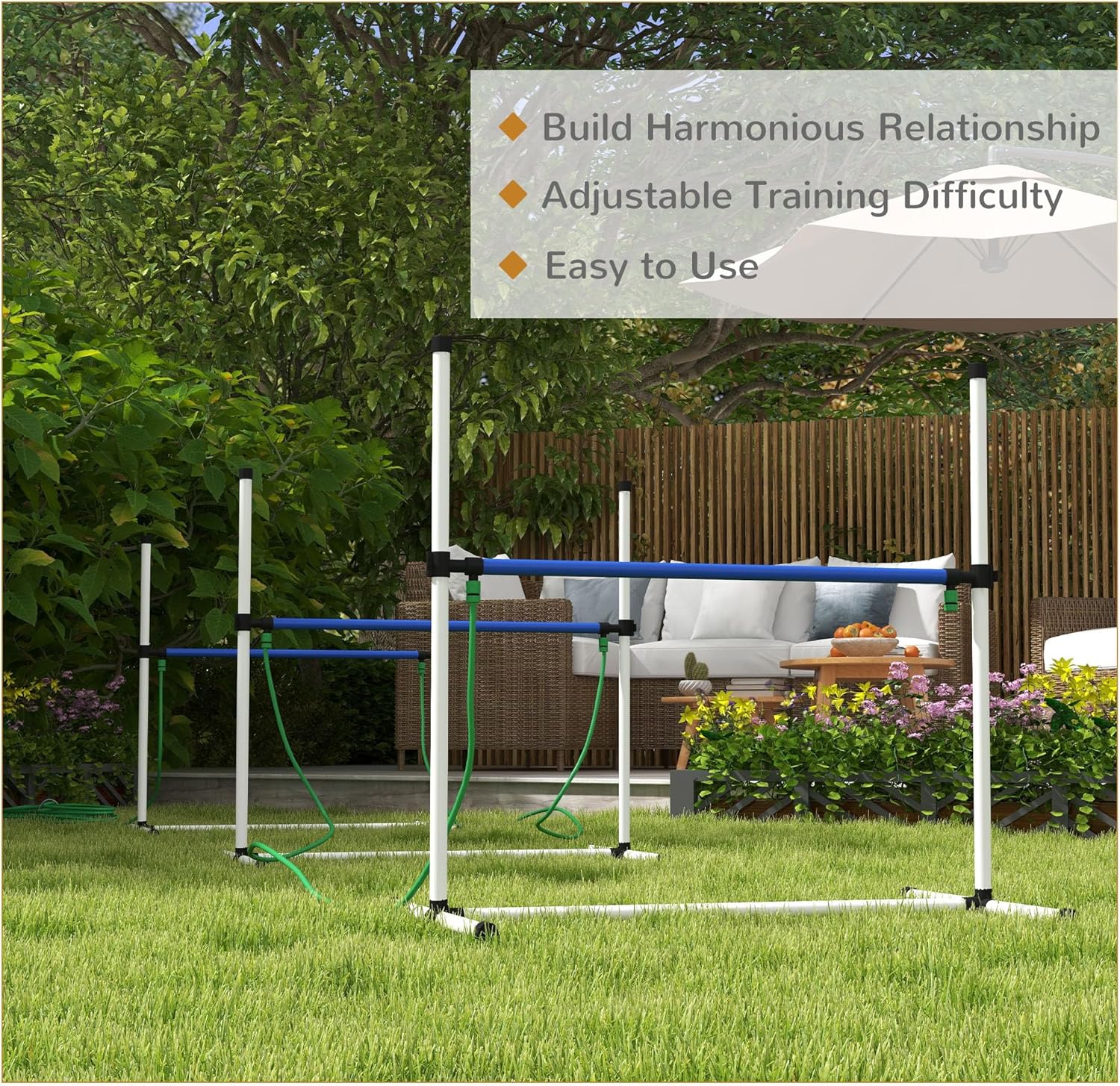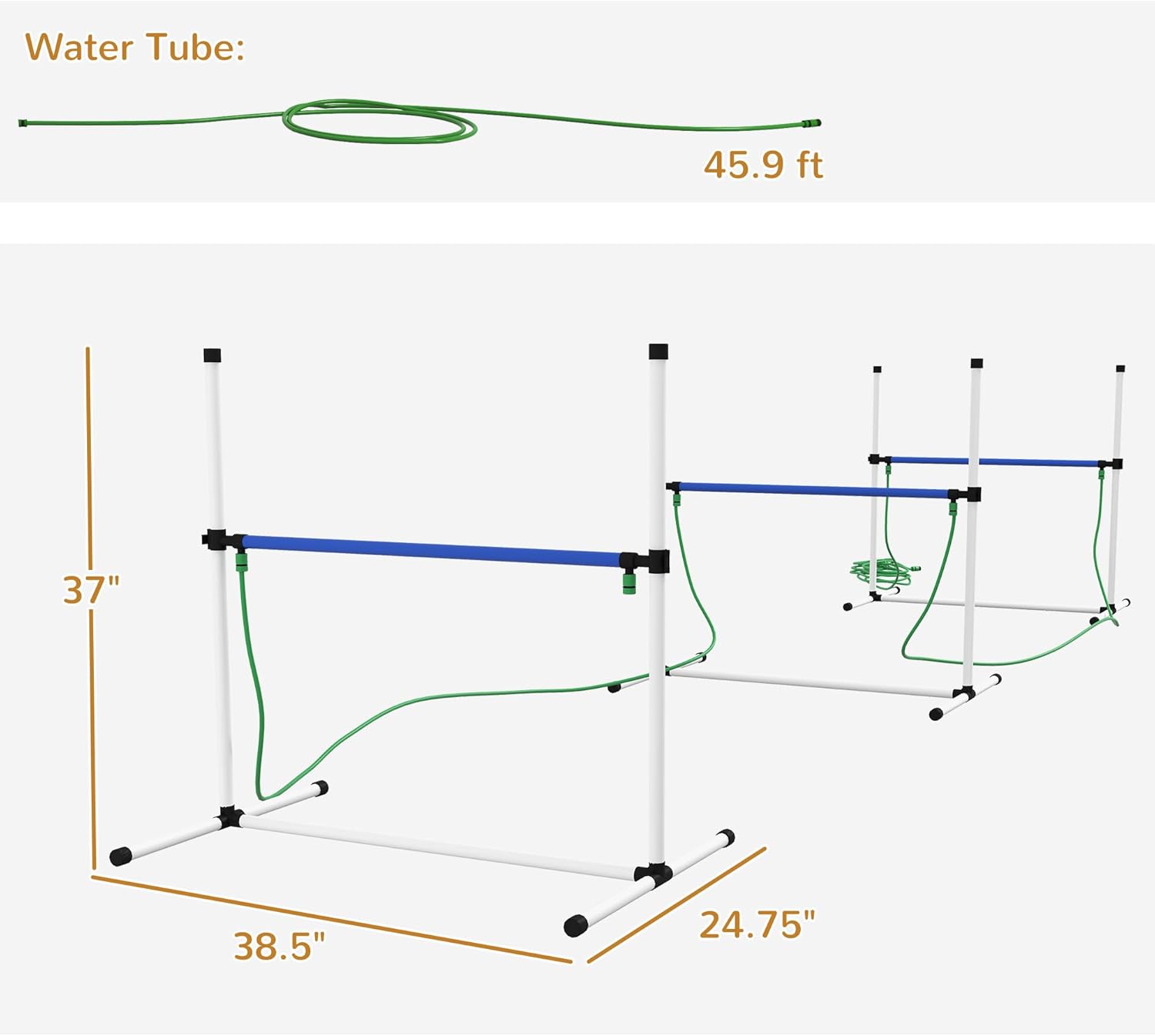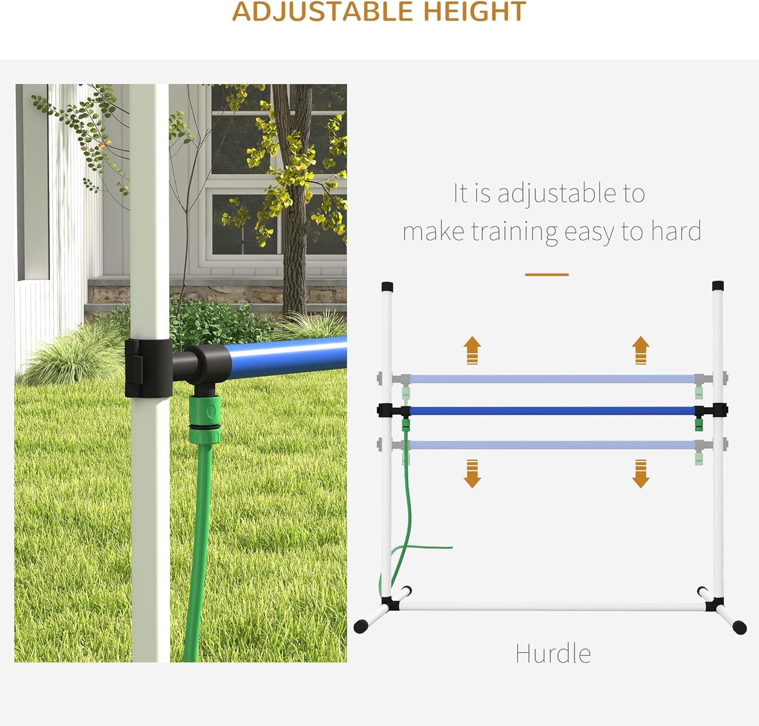 <br> Product Dimensions : 38.6 x 24.8 x 37 inches; 11 Pounds <br> Item model number : D07-047V00WT <br> Date First Available : May 23, 2024 <br> Manufacturer : Aosom LLC <br> ASIN : B0D537TNGS <br> Best Sellers Rank: #108,020 in Pet Supplies (See Top 100 in Pet Supplies) #68 in Dog Agility Jumps <br>Complete Dog Agility Training: This 4-piece dog agility set includes three hurdles, a whistle, a 600D carry bag, and a 45.9' water tube, offering a comprehensive setup for dog agility jumps and dog hurdle training.<br>Cooling Water Spray Feature: Equipped with a water spray function, this dog agility set is suitable for keeping your dog cool and refreshed during training sessions in hot weather.<br>Portable & Easy to Use: Designed for convenience, this dog obstacle course is easy to set up and carry outside, ensuring your dog can have a training session anytime.<br>Safe & Robust Materials: Crafted from safe materials suitable for flat ground, this set ensures secure training for your pet.<br>Pet Agility Set Info: Hurdle Dimensions: 38.6" L x 24.8" W x 37" H. Adjustable Pole Height: 2.8" - 35.4" H. Suitable for flat ground use. Assembly required. Recommendations: Place obstacles 2 meters apart and position the hurdle 10 meters from the tap.