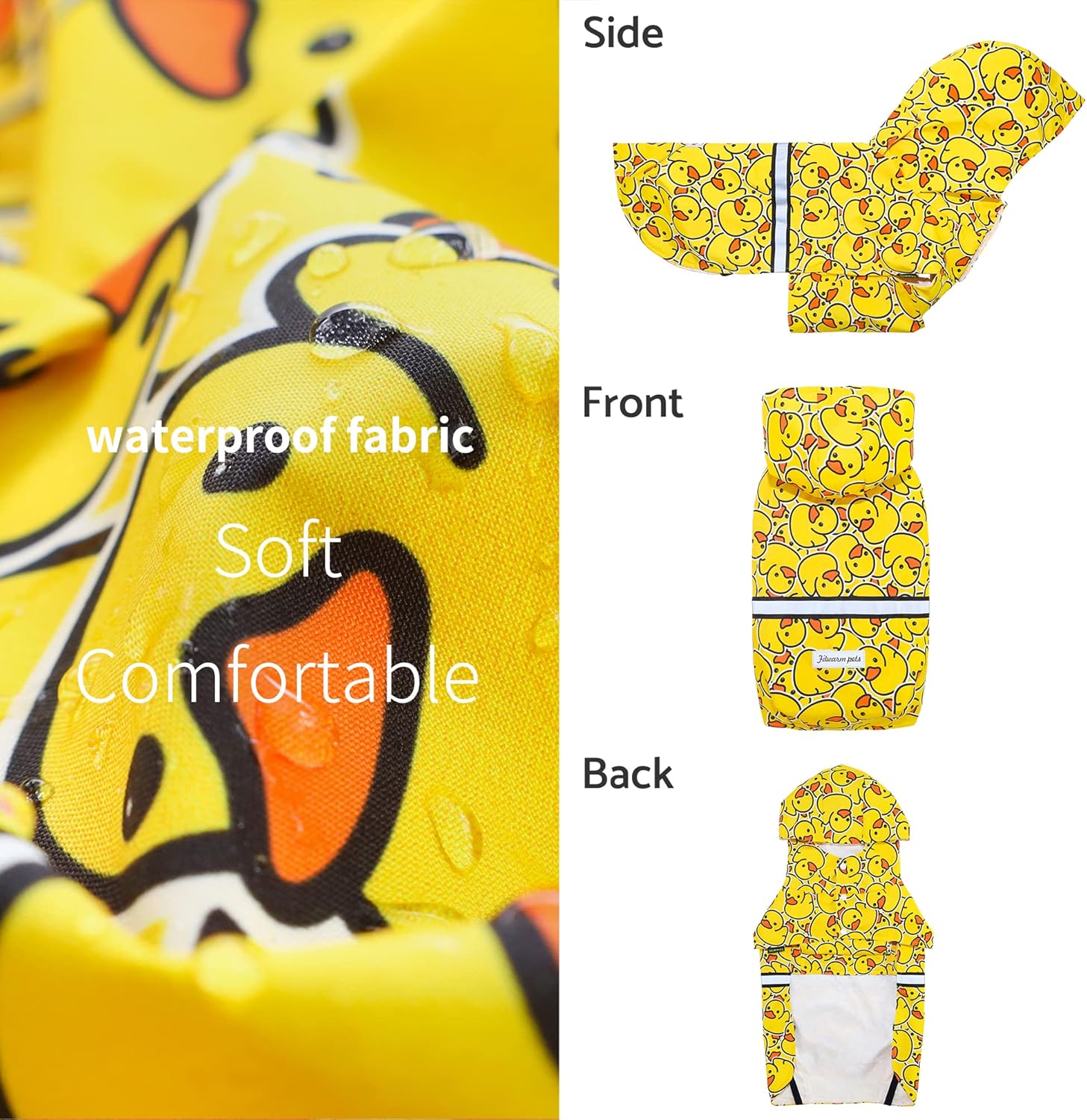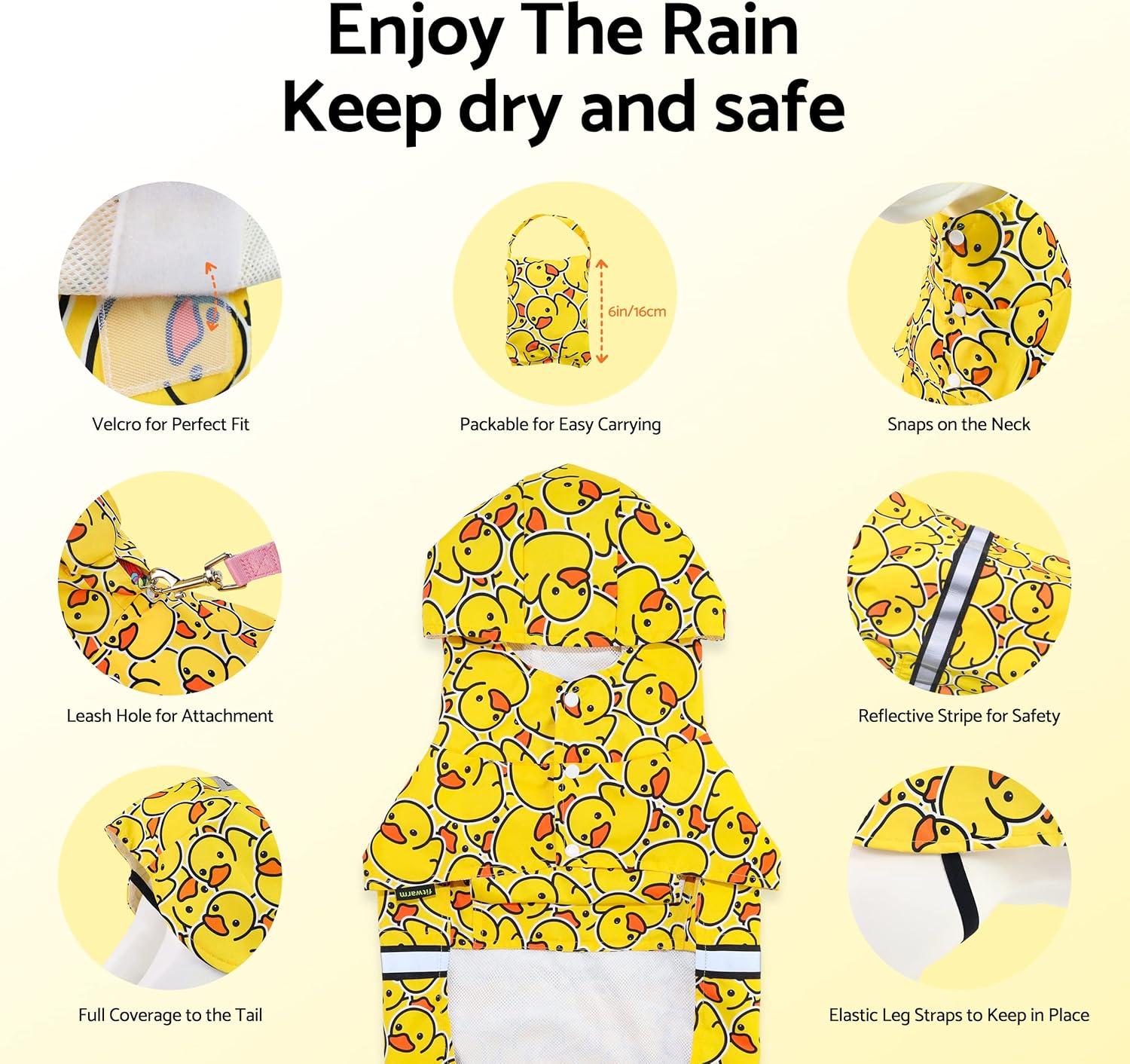 <br> Package Dimensions : 8.58 x 4.13 x 2.01 inches; 2.4 ounces <br> Item model number : Fwduckraincoat_S_B0770 <br> Date First Available : April 28, 2023 <br> Manufacturer : Fitwarm <br> ASIN : B0C3VS81CG <br> Best Sellers Rank: #23,248 in Pet Supplies (See Top 100 in Pet Supplies) #70 in Dog Raincoats <br> Customer Reviews: 4.3 4.3 out of 5 stars 260 ratings var dpAcrHasRegisteredArcLinkClickAction; P.when('A', 'ready').execute(function(A) { if (dpAcrHasRegisteredArcLinkClickAction !== true) { dpAcrHasRegisteredArcLinkClickAction = true; A.declarative( 'acrLink-click-metrics', 'click', { "allowLinkDefault": true }, function (event) { if (window.ue) { ue.count("acrLinkClickCount", (ue.count("acrLinkClickCount") || 0) + 1); } } ); } }); P.when('A', 'cf').execute(function(A) { A.declarative('acrStarsLink-click-metrics', 'click', { "allowLinkDefault" : true }, function(event){ if(window.ue) { ue.count("acrStarsLinkWithPopoverClickCount", (ue.count("acrStarsLinkWithPopoverClickCount") || 0) + 1); } }); }); <br>FOR SMALL DOGS OR CATS. Please priority follows the chest size. Size Small, fits 10" back, 14" chest. Recommended for: Maltese, Pomeranian, Miniature Pinscher, Bichon Frise, Shih Tzu, Poodle, Miniature Dachshund, Sphynx, and Havanese.<br>Water resistant fabric crafted in 50% polyester and 50% polyurethane. This rain slicker provides mesh lining for comfort. Its soft, packable design allows easy storage, suitable for all seasons - spring, summer, fall, and winter.<br>Rubber duck rain suit with a hood for full coverage. Featuring reflecting stripes and a harness opening with flap for visibility and convenience. Attached adjustable velcros and button up closures for a secure fit.<br>Perfect for wet weather, this rain coat will keep your pet dry and comfortable during raining walks and outside adventures. Bright stripe ensures your pet stays safe during night time walks.<br>Professional designed with comfort and practicality. Soft and breathable fabrics for cozy wear, while allowing for easy on /off, convenient potty breaks, flexible movement, and wear tested on our pet models to ensure the best fit.