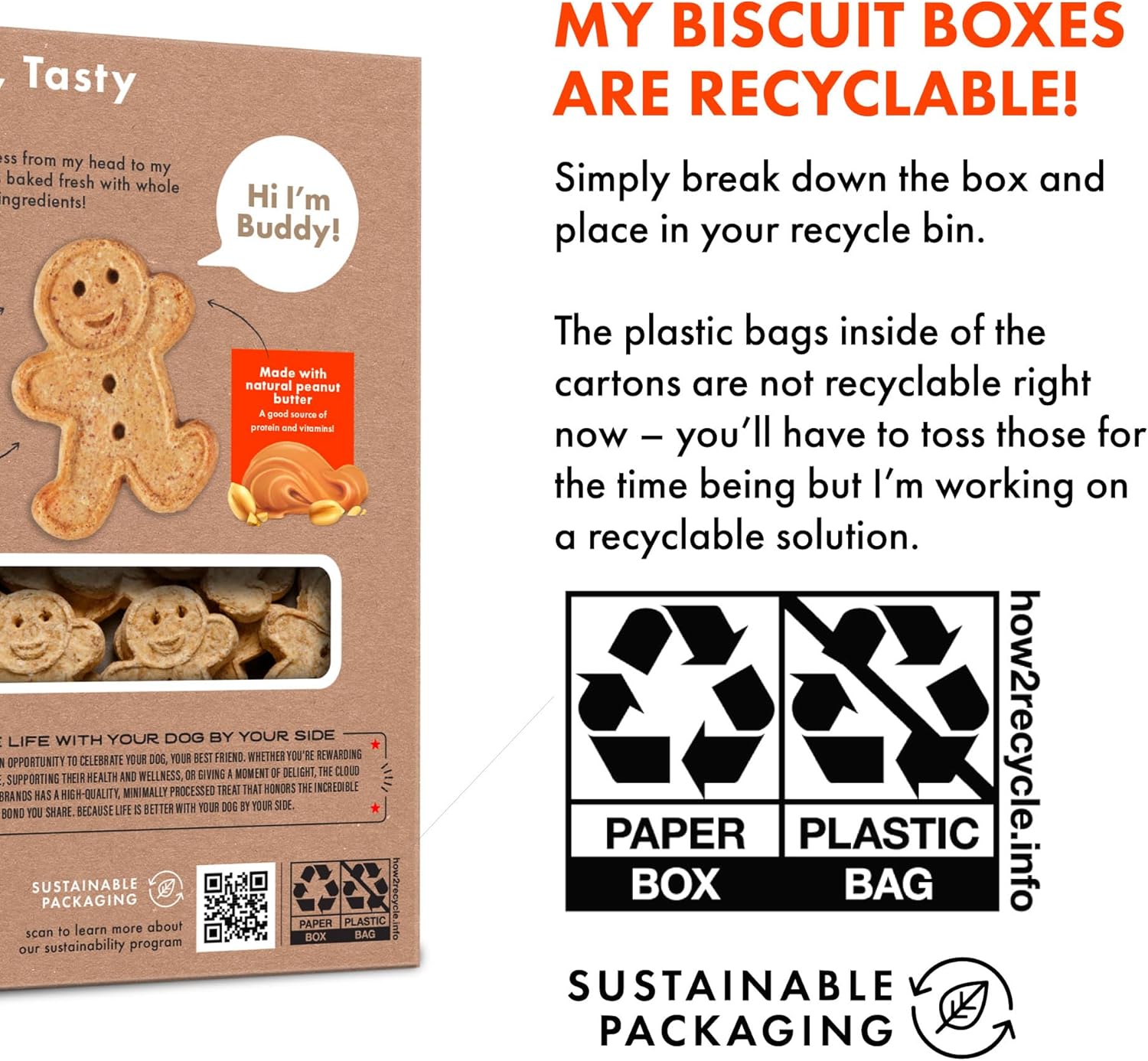 RECYCLABLE: After your pup has enjoyed their delicous treats, simply throw away the empty plastic bag, and you can recycle Buddy’s cardboard carton!