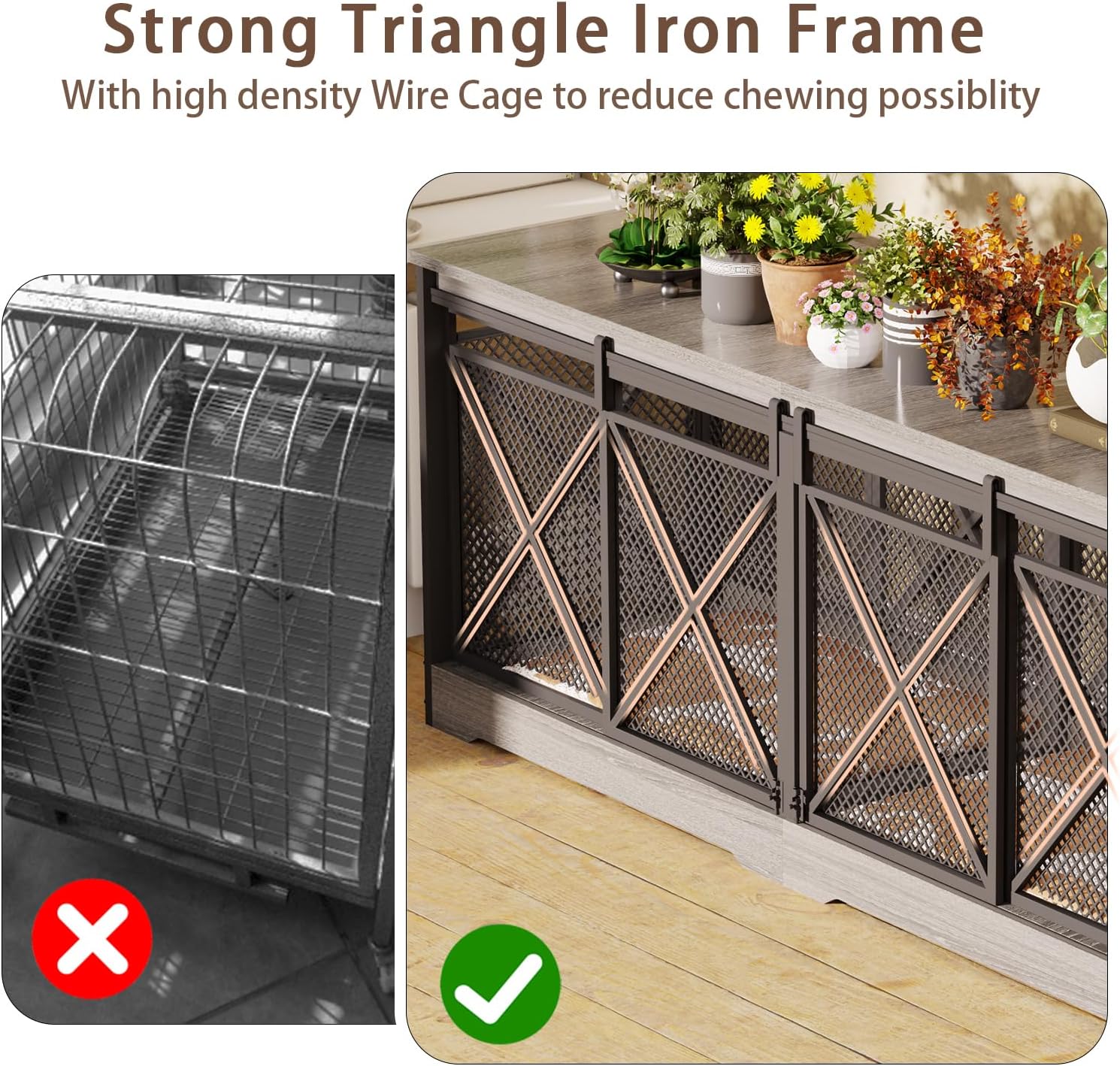 <br> Product Dimensions : 78 x 23.8 x 31.8 inches <br> Item model number : GL-202504 <br> Date First Available : June 20, 2025 <br> Manufacturer : COZPAW <br> ASIN : B0FDTLT3WD <br> Best Sellers Rank: #43,696 in Pet Supplies (See Top 100 in Pet Supplies) #96 in Furniture-Style Dog Crates <br> Customer Reviews: 4.5 4.5 out of 5 stars 37 ratings var dpAcrHasRegisteredArcLinkClickAction; P.when('A', 'ready').execute(function(A) { if (dpAcrHasRegisteredArcLinkClickAction !== true) { dpAcrHasRegisteredArcLinkClickAction = true; A.declarative( 'acrLink-click-metrics', 'click', { "allowLinkDefault": true }, function (event) { if (window.ue) { ue.count("acrLinkClickCount", (ue.count("acrLinkClickCount") || 0) + 1); } } ); } }); P.when('A', 'cf').execute(function(A) { A.declarative('acrStarsLink-click-metrics', 'click', { "allowLinkDefault" : true }, function(event){ if(window.ue) { ue.count("acrStarsLinkWithPopoverClickCount", (ue.count("acrStarsLinkWithPopoverClickCount") || 0) + 1); } }); }); <br>🐾【Multi-Functional Dog Crate Furniture】 Designed for both practicality and style, this dog kennel furniture provides a safe, cozy shelter for your pet while doubling as a chic TV stand, side table, or coffee table. Its spacious top surface holds pet supplies, photo frames, or plants, blending seamlessly into your home decor while saving space.The modern mesh-panel design gives it a sleek, contemporary look that integrates beautifully into modern and minimalist interiors.<br>🐾【Chew-Resistant & Sturdy】 This dog crate furniture is built with heavy-duty metal and premium wood, featuring a excellent quality metal coating for safety. The reinforced wood-iron structure enhances chew resistance while providing comfort, durability, and easy maintenance. The bottom wooden board offers stable support, protecting your pet’s paws from injury.The dense mesh panels prevent dogs from biting through the bars or getting their paws stuck, offering a safer and more durable option than traditional crates.<br>🐾【Adjustable Spacious double dog crate】 The removable divider allows you to switch between single and double compartments effortlessly. Designed for large breeds, this double dog crate furniture offers ample room for your dogs to sit, stretch, and lie down comfortably.The semi-enclosed mesh design creates a secure, private retreat that helps reduce outside distractions and provides a stronger sense of comfort and safety for anxious pets.<br>🐾【Thoughtful Details】This decorative dog kennel furniture comes with safety latches to ensure your dog won't escape easily. The raise bottom of the kennel helps to improve air circulation and reduce moisture at the bottom, creating a comfortable and dry living environment for your dog.The fine mesh walls also block out more dust and prevent debris from entering the crate, creating a healthier and cozier living space for your dog.<br>🐾【Spacious Double Dog Crate】 Measuring 78"W x 23.8"D x 31.8"H, this furniture dog crate provides generous living space for two medium/large dogs, reducing anxiety and ensuring comfort. Each compartment measures 37.5"W x 22"D x 26.7"H, ideal for free movement.The dense mesh walls provide privacy while maintaining ventilation, balancing both safety and comfort. Before purchasing, measure your dog to ensure proper fit and mobility space.<br>🐾【Easy Assembly】 This XXL dog crate comes with all necessary hardware, tools, and instructions for quick, hassle-free assembly. The furniture-style dog crate design ensures stability,you can easily and smoothly assemble the dog crate fruniture.<br>🐾【Sliding Door Design 】Smooth sliding doors open and close without blocking walkways or taking up extra room. Ideal for hallways, corners, or beside furniture, keeping your space open and easy to move around.
