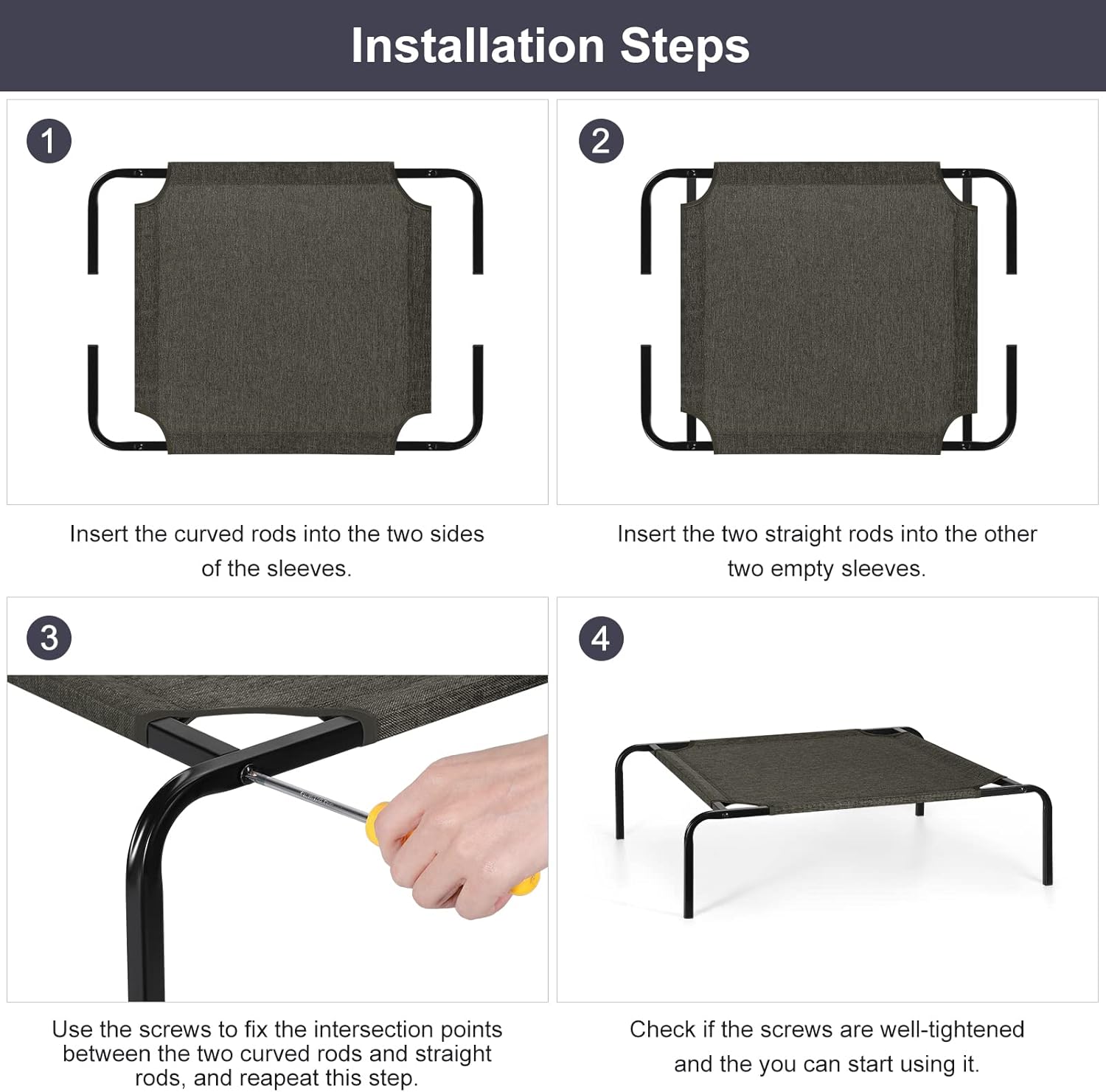 <br> Product Dimensions : 26.2 x 21.2 x 7.5 inches; 4.66 ounces <br> Date First Available : December 22, 2021 <br> Manufacturer : OYEAL Direct <br> ASIN : B09NY4ZCWP <br> Best Sellers Rank: #42,244 in Pet Supplies (See Top 100 in Pet Supplies) #624 in Dog Beds <br> Customer Reviews: 4.2 4.2 out of 5 stars 793 ratings var dpAcrHasRegisteredArcLinkClickAction; P.when('A', 'ready').execute(function(A) { if (dpAcrHasRegisteredArcLinkClickAction !== true) { dpAcrHasRegisteredArcLinkClickAction = true; A.declarative( 'acrLink-click-metrics', 'click', { "allowLinkDefault": true }, function (event) { if (window.ue) { ue.count("acrLinkClickCount", (ue.count("acrLinkClickCount") || 0) + 1); } } ); } }); P.when('A', 'cf').execute(function(A) { A.declarative('acrStarsLink-click-metrics', 'click', { "allowLinkDefault" : true }, function(event){ if(window.ue) { ue.count("acrStarsLinkWithPopoverClickCount", (ue.count("acrStarsLinkWithPopoverClickCount") || 0) + 1); } }); }); <br>【Elevated Dog Cat Bed】:Our portable small dog bed is specially designed with 7.5'' elevated from the ground, Which would highly increase airflow around the dog cot and provides a cleaner, dryer, cooler, and more comfortable environment for your pets, especially in the hot summer.<br>【Sturdy & Enduring】: The elevated dog bed consists of a sturdy metal frame and a high-quality polyester fabric cover. All the materials mentioned above make the dog bed more sturdy, enduring, and hold up to 60 pounds, so as to provide your dogs or cats a more stable and comfortable relaxing experience.<br>【Indoor & Outdoor Use】: The elevated pet bed is lightweight and designed with 4 anti-slip rubber mats. Besides, the breathable fabric cover would quickly dry up after raining and keep your pets cooler in the hot summer. These characteristics mentioned above enable our pet bed can also be put outdoor, especially for camping, picnicking, and traveling.<br>【Easy Assembly & Cleaning】: Detailed manual and screws are all provided. Please read the manual carefully before starting assembling and following the steps, then your pet will have a perfect dog bed. (The instruction manual is of vital importance for your assembling process, please do not forget to read it.)<br>【Excellent After-sale Service】: We are always committed to providing every customer an excellent after-sale service including technical support and goods return for any quality reasons. If you have any problems with the elevated dog bed, please do not hesitate to reach out to us, and we will give you a satisfactory solution ASAP.