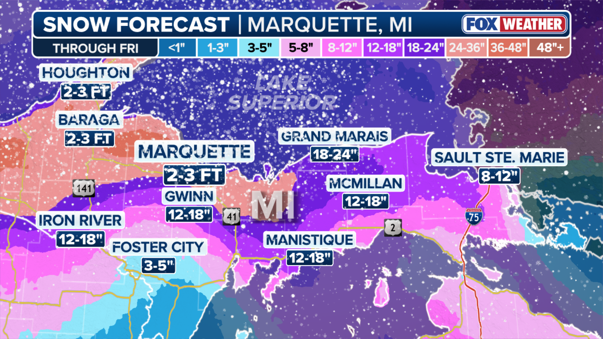 By Thanksgiving Day, lake-effect snow will be fully underway across the U.P. and snow bands could be intense and long-lasting. Marquette could see between 2-3 feet of snow through Friday, although snow totals will be highly dependent on wind direction.