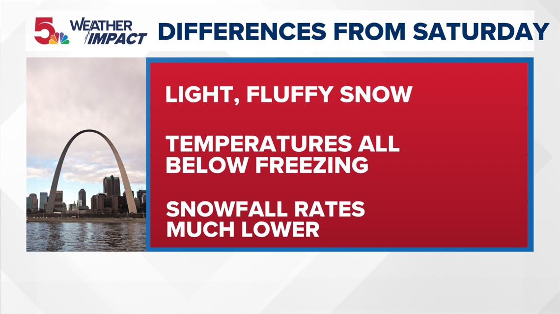 The main differences from Saturday will be that our snowfall rates are much lower than what we encountered during the morning. Temperatures will also be well below freezing throughout the day, so any snow that falls will stick quickly. This snow will also be low moisture content snow, which means it will be light and fluffy. You can clear this snow with a leaf blower or brush it away with your glove on the windshield. Bottom line: not as many widespread impacts, but spots will definitely be slower to travel.