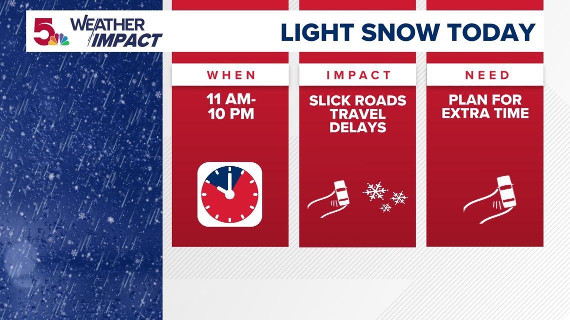 Light snow begins after noon as temperatures remain below freezing. Light snow will persist through the majority of the afternoon and evening, with even some light sleet mixing in near Farmington, and our southern areas.