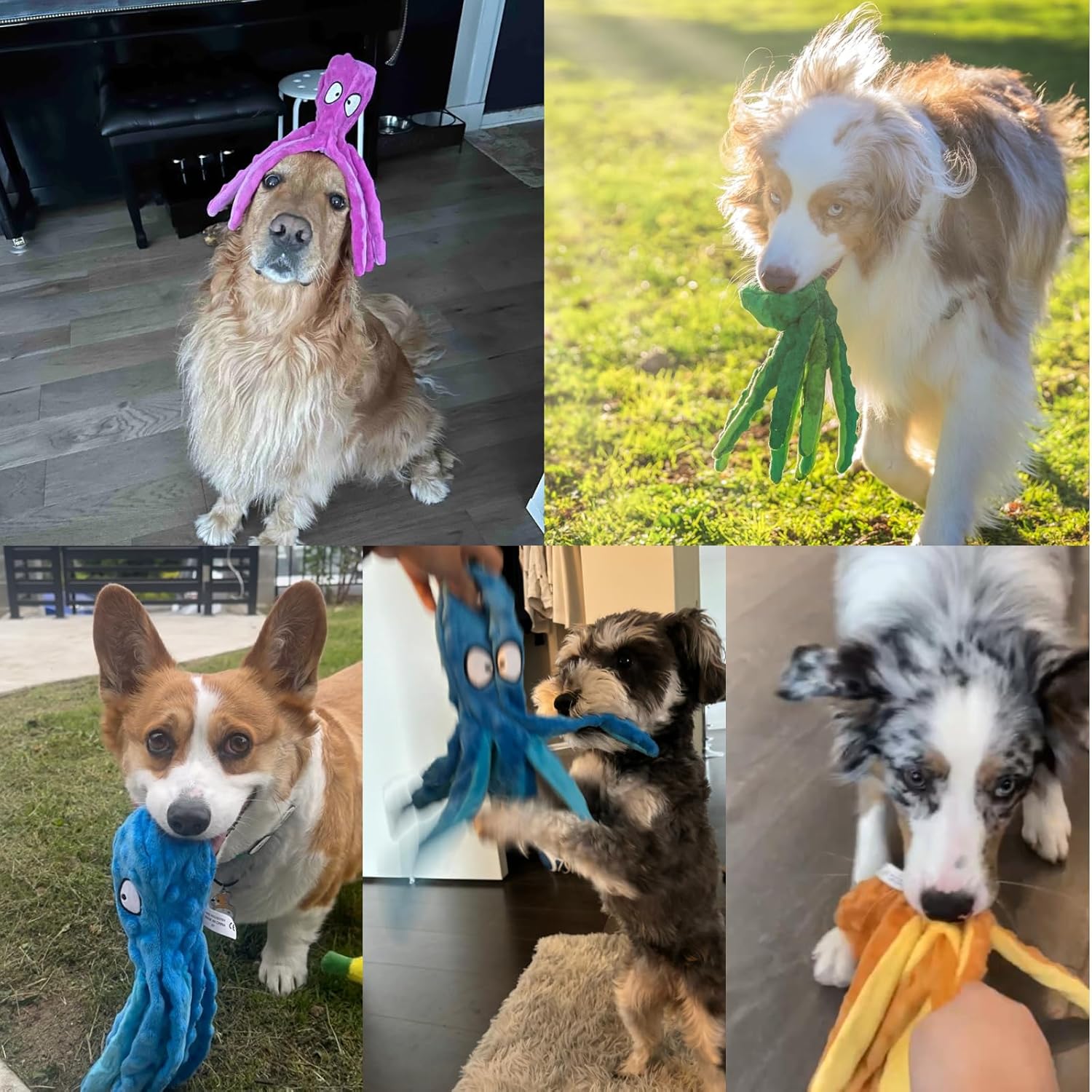 <br> Product Dimensions : 3.15 x 3.15 x 12.6 inches; 4.48 ounces <br> Item model number : YS10001 <br> Date First Available : June 30, 2021 <br> Manufacturer : HGB <br> ASIN : B098BB1HGN <br> Best Sellers Rank: #939 in Pet Supplies (See Top 100 in Pet Supplies) #22 in Dog Squeak Toys <br> Customer Reviews: 4.2 4.2 out of 5 stars (6,464) var dpAcrHasRegisteredArcLinkClickAction; P.when('A', 'ready').execute(function(A) { if (dpAcrHasRegisteredArcLinkClickAction !== true) { dpAcrHasRegisteredArcLinkClickAction = true; A.declarative( 'acrLink-click-metrics', 'click', { "allowLinkDefault": true }, function (event) { if (window.ue) { ue.count("acrLinkClickCount", (ue.count("acrLinkClickCount") || 0) + 1); } } ); } }); P.when('A', 'cf').execute(function(A) { A.declarative('acrStarsLink-click-metrics', 'click', { "allowLinkDefault" : true }, function(event){ if(window.ue) { ue.count("acrStarsLinkWithPopoverClickCount", (ue.count("acrStarsLinkWithPopoverClickCount") || 0) + 1); } }); }); <br>[2 Pack Octopus Dog Toys] These funny octopus large dog toys with bright colors and cute looks will attract your dog’s interest and keep them happy. These dog toys for large dogs are soft and lightweight, the tug of war dog toy with eight legs great for tug and fetch, easy for pets to carry, toss and roll around with. It's a ideal holiday or christmas gift for puppies, small, medium, and large dogs<br>[Squeaky & Crinkle Dog Toys] These interactive dog squeaky toys inner built squeakers will stimulate the passion of your pets by keep making the sound when pressing it. Great dog toys to keep them busy. These puppy toys with hard-to-resist crinkle paper sounds will be great toys to interact with your dog, help to get more exercise, reduce anxiety and boredom<br>[No Stuffing Dog Toys] These plush dog chew toys are without stuffing, which means no dangerous stuffing hidden in our puppy teething toys, it is very safe for your puppy to chew and play with, without worrying about choking on or cleaning problems. You will not need to worry about the stuffing falling all over the room anymore, is a great dog toys for small dog, tough dog toys for aggressive chewers large breed<br>[Unstuffed Plush Dog Toys] These unstuffed dog toys are made with premium quality polyester which ensured the durability of the indestructible dog toys to be stretched and bitten without getting easily broken. It is also a great tool working as a dog's toothbrush, the surface fuzz rubbing against the puppy's tooth to wipe off the stain and leave no bad smells in the mouth. Keep your puppy clean and healthy by biting the toys more<br>[About Customer Service] We are committed to providing customers with quality products and services, letting you enjoy the best dog products with your lovely pets. Please reach out to us if you have any questions, we are always at your service. TIPS: 1. These puppy chew toys are machine washable and easy to clean. 2. Not for aggressive heavy chewers. 3. Size: 8cm x 32cm (3.14in x 12.6in)