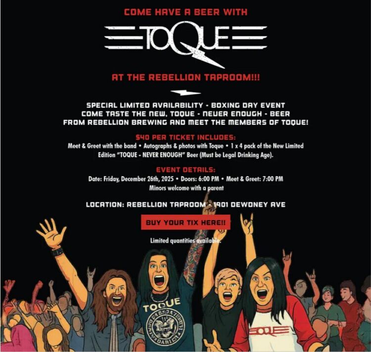 Toque guitarist Cory Churko says, “I can’t wait to knock back a few with our fans and friends. We love this beer! This night could get a little crazy as we celebrate the Holidays with our awesome fans. We were involved with every part of this collaboration with Rebellion Brewing. It’s cool to be doing this in Todd Kerns’ and my home Province, as we kick off a few Winter Shows too. It’s gonna be a ‘ol Prairie Social. Let’s GIVE’R!”