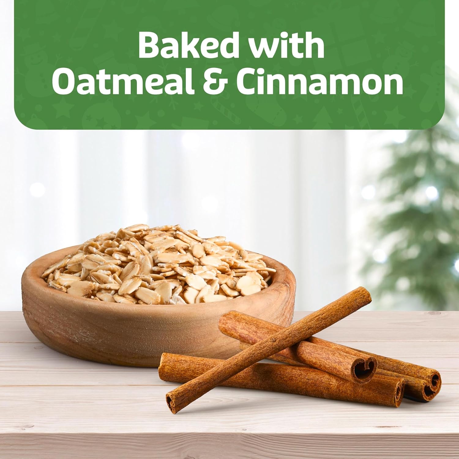 Customers love these dog treats for their oatmeal and cinnamon flavor, cute appearance, good price, and festive holiday theme. The biscuits receive mixed feedback about their taste and hardness, with some finding them extremely hard to chew. Additionally, customers report issues with the treats breaking into pieces.