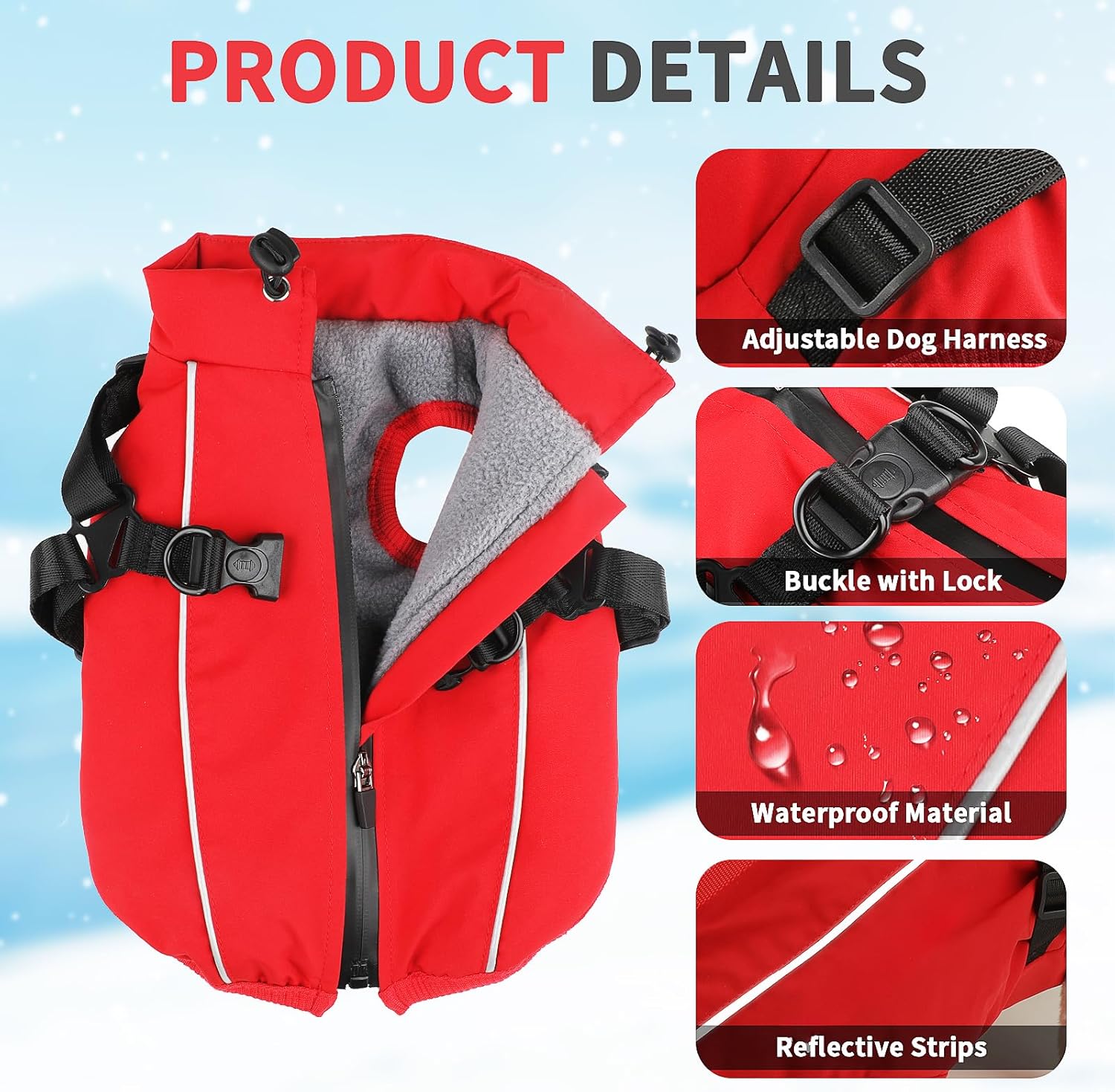 <br> Package Dimensions : 11.14 x 9.96 x 2.44 inches; 6.38 ounces <br> Item model number : 5001 <br> Date First Available : July 3, 2025 <br>Water-Resistant & Windproof Layer Crafted with a 100% polyester outer shell coated in durable PE film, this dog jacket repels light rain and snow. The gray fleece lining traps body heat while sealing out wind, providing reliable warmth during winter walks, damp conditions, or chilly outdoor adventures.<br>Snag-Free Back Zipper & Dual D-Ring Leash System Back zipper features built-in protective fabric guard to prevent fur catching. Equipped with two identical 3-hole metal D-rings – symmetrically positioned for balanced leash attachment. Allows quick switching between front/rear clip harnesses or dual-lead setups.<br>360° Reflective Strips for Night Safety High-visibility reflective strips on sides and back enhance visibility in low-light conditions. Ensures your dog remains seen during evening walks, early morning hikes, or foggy weather, adding critical safety for urban and rural environments alike.<br>Comfort-Focused Design & Durable Construction Elastic neckline, leg openings, and waist provide a snug fit without skin irritation or wind exposure. Soft fleece interior resists pilling, while reinforced stitching and abrasion-resistant fabric withstand daily wear. Ideal for neighborhood strolls, park visits, or cold-weather playtime.<br>Precise 5-Size Fit Guide (Measure First!) Sizes S-XXL fit chests 16.5"-24.4" (detailed cm/inch chart in images). Key measurements: Chest circumference (most critical), neck, and back length. Pro Tip: For thick-coated breeds or if between sizes, select one size up for optimal comfort.
