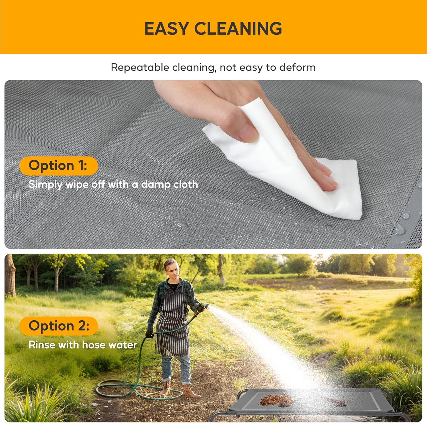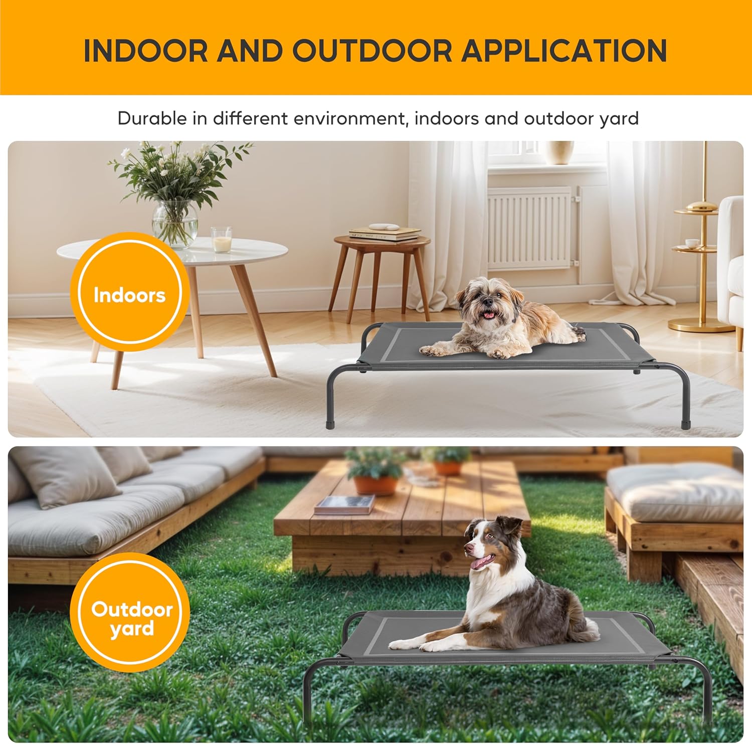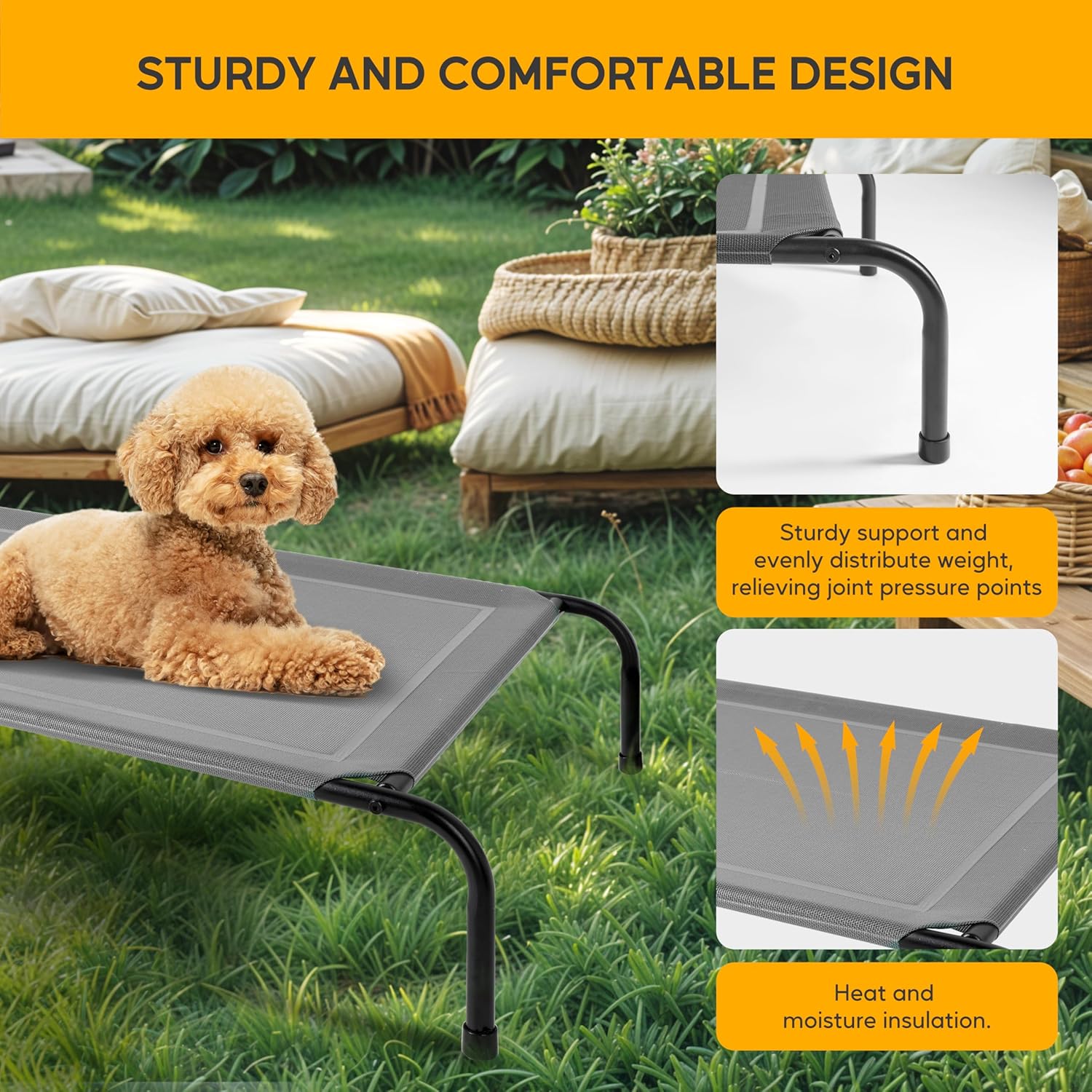 <br> Product Dimensions : 42 x 25.5 x 8 inches; 6.6 Pounds <br> Item model number : Cooling Elevated Dog Bed Outdoor <br> Date First Available : October 14, 2024 <br>Quick assembly and portable: The dog bed can be directly installed in a few minutes, the lightweight design of this elevated dog bed provides increased portability and makes travel simple. Suitable for both indoor and outdoor use<br>High-quality Material: Durable recyclable Teslin mesh features heat-resistance, sturdy, breathable, and holds up against scratching and chewing. Size: 42"x25.5"x8". The strength-tested lightweight metal frame supports dogs up to 110 lbs<br>Easy to clean: Our dog bed is super easy to clean, simply hose off with water, a hose, or wash with a damp towel, ensuring your pet's sleeping area stays hygienic<br>Friendly to dogs: It is composed of powder-coated steel, heavy-duty Teslin mesh, and non-skid rubber feet, provides strong stability and high load-bearing capacity, provides excellent support and even pressure distribution to reduce joint and muscle pain<br>Cooling Comfort: This dog bed's breathable fabric and elevated design allows air to flow right through the fabric, keeping your dog cool all year long. Sleeping with an elevated dog bed is more comfortable, dryer, cleaner and healthier compared to the ground