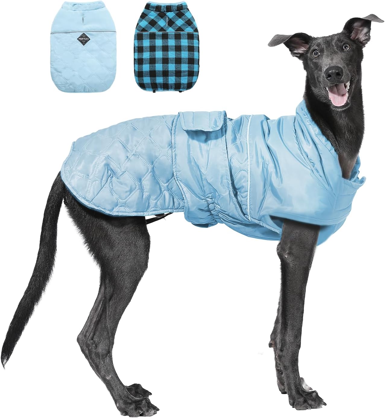 <br> Package Dimensions : 11.06 x 4.33 x 3.19 inches; 7.37 ounces <br> Item model number : AM01-AYD0337BU-S <br> Date First Available : July 22, 2022 <br>Windproof and Water-Repellent: Our lightweight, three-layer dog apparel ensures optimal warmth and comfort with its skin-friendly woven plaid, padded cotton, and waterproof exterior. Thanks to ultrasonic embossing technology, it's pinhole-free, washable, and perfect for protection against cold and water.<br>Two Looks in One: This reversible dog coat offers two styles in one. Just flip it over for a new look! The classic British plaid side is perfect for indoor wear, while the plain side is ideal for outdoor activities like hiking and walking. It's one coat with two distinct styles.<br>Design for Perfect Fit: With velcro closure and adjustable elastics on the collar and chest, this dog coat is easy to put on and take off, while the elasticated loops on legs make clothes better fit the body curves. Also, we upgraded the velcro closure, which is non-sticky and easy to clean, longer&wider to fit all size dogs’ neck and body.<br>Leash Hole and Reflective Strips: The leash hole on the back of the neck allows for easy leash attachment, making walks more convenient. Additionally, the coat features reflective strips along the edges and back for enhanced visibility during night walks and runs, ensuring your dog stands out in the dark.<br>Suits All Dog Sizes: From XS to XXXL, our dog clothes cater to all breeds, small to large, including Schnauzer, Beagle, Dachshund, Bulldog, Rottweiler, Shepherd, Doberman, Labrador, Dalmatian, and more. For the right fit, measure your dog's neck width and body length and refer to our size chart. If your dog falls between two sizes, opt for the larger one to ensure comfort.