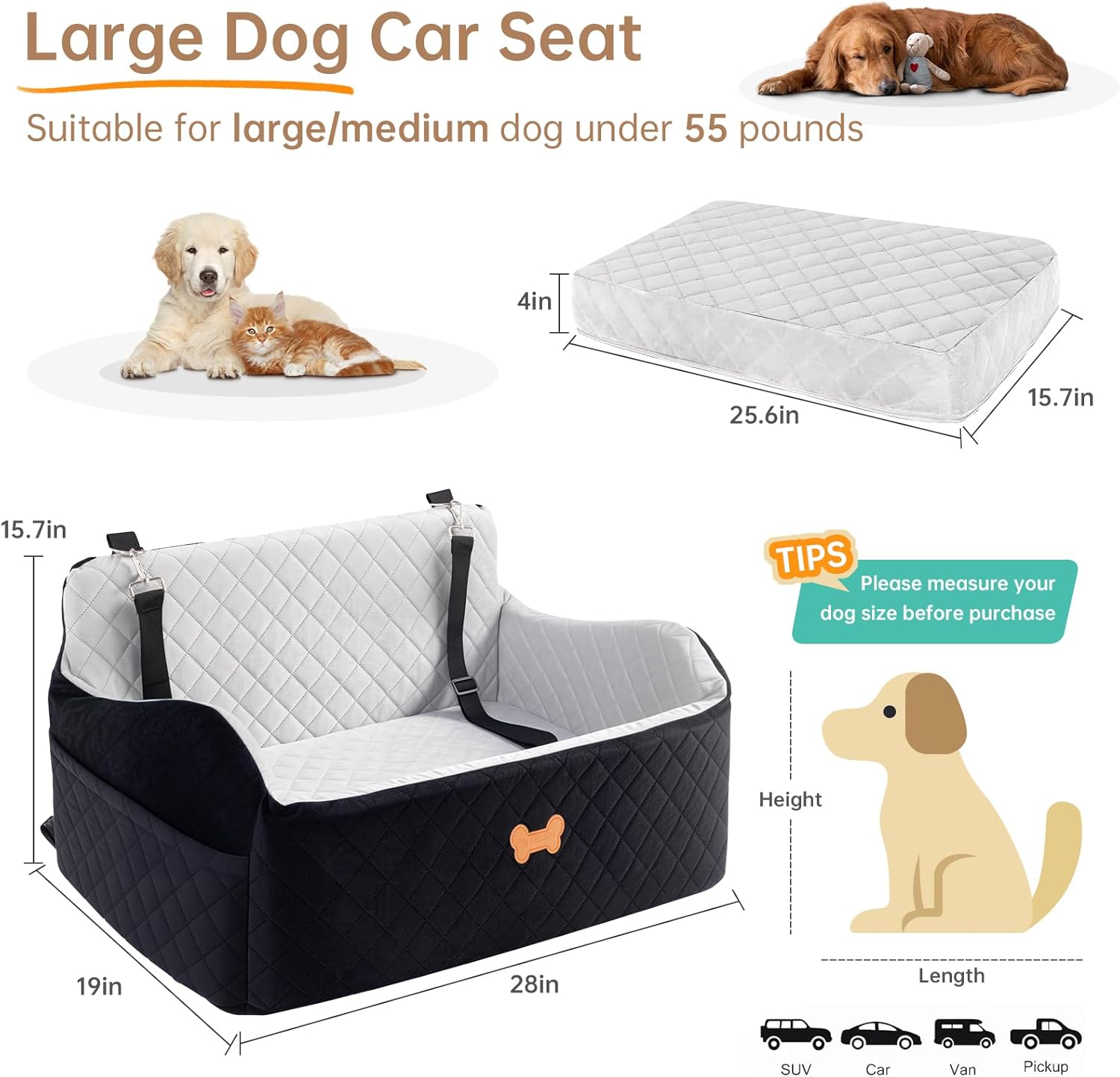 <br> Product Dimensions : 28 x 19 x 15.7 inches; 5.27 Pounds <br> Item model number : SEAT-L <br> Date First Available : February 24, 2025 <br>LARGE SIZE DOG CAR SEAT: This dog car seat measures 28"(L) x 19"(W) x 15.7"(H), providing ample space for large or medium dogs up to 55 pounds or two small pets up to 25 pounds. The dog car seat is suitable for almost all types of vehicles, such as cars, trucks, and SUV, and you can easily install it in the backseat or trunk of a car with a lot of space.<br>DOG CAR BOOSTER SEAT: This dog booster car seat features a streamlined curved design with a 3.8 inch (T) bottom cushion, which is designed to give your pet a better view of the road and help ease their anxiety during car rides.<br>PET SAFETY DESIGN: The car dog seat includes a safety belt channel at the bottom, allowing the safety belt to pass through and non-slip fabric sewn to the bottom. It also comes with an adjustable shoulder strap that attaches to the seat headrest and two safety leashes that can be attached to your dog's harness to prevent them from jumping out the window, allowing your dog to enjoy the ride without worrying about it interfering with your driving.<br>DETACHABLE AND WASHABLE: Simply open the zipper of the seat and cushion, take out the sponge, and then wash the dog seat fabric cover in the washing machine. WARM TIPS: The dog car seat is vacuum compressed package, after opening the package, please wait patiently for about 24-48 hours to recover to the best condition.<br>MULTI-FUNCTIONAL USE: The dog car seat is not only suitable for use in the car, but can also be used outdoors or at home as a dog bed or dog sofa. In addition, there are 2 large pockets on both sides of the dog car seat for storing your dog's treats, toys, essentials and more.
