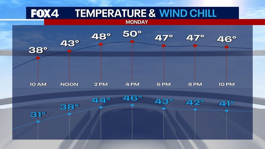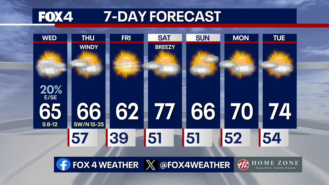 Highs climb back into the low 60s on Tuesday. Noticeably milder air settles in for the middle and end of the week, with high temperatures expected to reach the mid-60s to low-70s. There is a slight chance for isolated showers far southeast of the Metroplex on Wednesday, but overall, dry conditions are expected for the rest of the week.