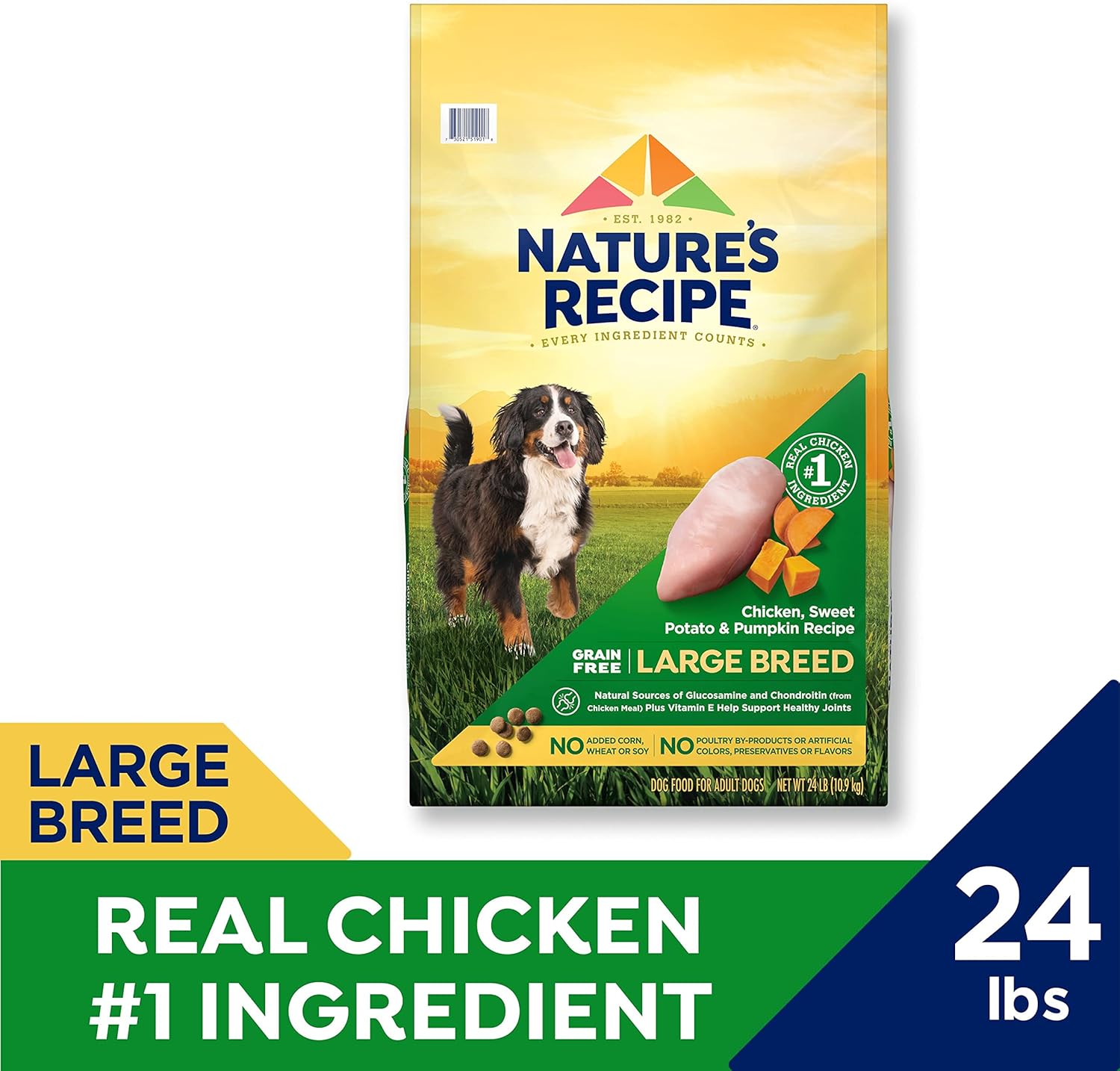 Nature’s Recipe Large Breed Grain Free Chicken, Sweet Potato & Pumpkin Recipe dry dog food makes it easier (and more satisfying) than ever to fuel your dog’s wag. This easy to digest dog food is made with real chicken as the number one ingredient, along with nutrient-dense carbohydrate sources like sweet potato and pumpkin. Fiber, active nutrients and antioxidants also help support digestion, immune system health and many other aspects of your dog’s overall health with every bite. We don’t include ingredients that would cause our recipe to fall short of amazing —there’s no added corn, wheat or soy protein, no poultry by-product meal and no artificial flavors or preservatives. Pick up a bag of our large breed dog food to help your dog live large.