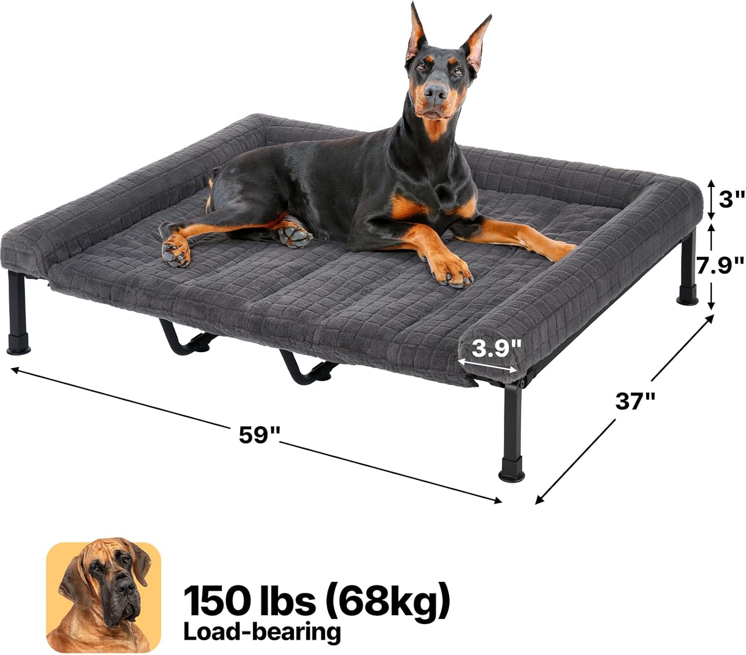 <br> Product Dimensions : 59.06 x 7.87 x 37.01 inches; 18.96 Pounds <br> Item model number : CWC2507ACP <br> Date First Available : May 27, 2025 <br>Plush & Supportive Bolster Cushion: The ultra-soft bolster is filled with orthopedic memory foam for optimal neck support, while the bottom mat filled with PP cotton. The luxurious plush surface creates a cozy, calming nest, promoting deep, restful sleep<br>Removable & Anti-Slip Design: The cushion top is detachable for easy machine washing, featuring a non-slip base and secure fastenings, keeping the cushion firmly in place, even for active dogs<br>All-Season Comfort: Remove the cushion, the raised dog bed promotes airflow with breathable mesh, keeping pets cool in summer. The plush cushion adds extra cozy in winter, keeping them away from cold, hard floors and easing joint pressure<br>Heavy-Duty & Easy Assembly: Featuring a powder-coated steel frame, scratch-resistant mesh, and non-slip rubber feet, this bed offers superior stability and supports up to 150 lbs. Easy Assembly in minutes with no tools required<br>Dog Couch Bed for Large Dogs: Generously sized at 59 x 37 x 7.9inches , it fits dogs up to 57" long, accommodating all sleeping positions. Ideal for breeds like Great Dane, Bernese, Golden Retrievers, and other large dogs