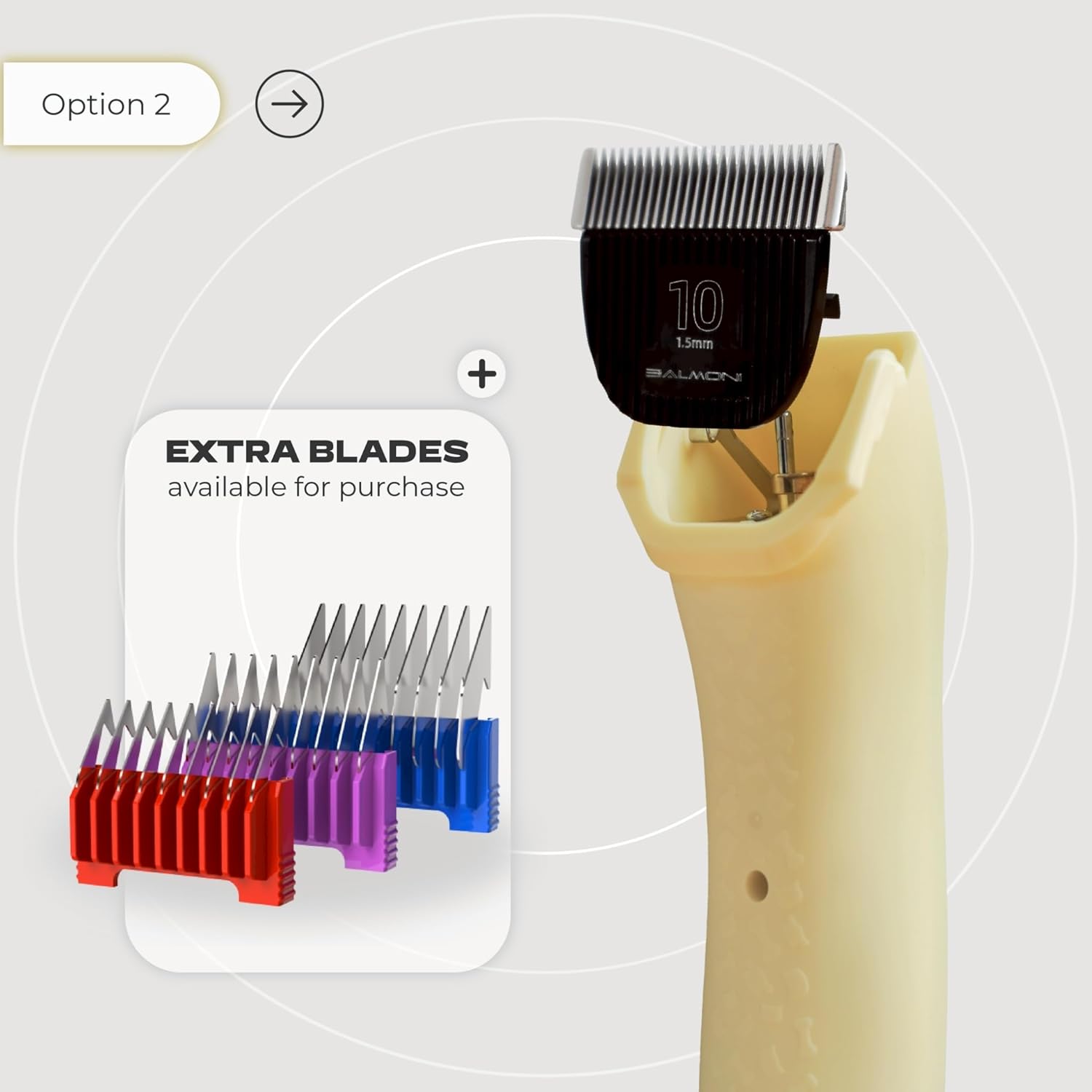 <br> Product Dimensions : 4.72 x 2.24 x 8.48 inches; 13.15 ounces <br> Item model number : SV-01 YC <br> Batteries : 1 Nonstandard Battery batteries required. (included) <br> Date First Available : October 3, 2025 <br> Manufacturer : Balmoni <br> ASIN : B0FGY4H21X <br> Best Sellers Rank: #325,825 in Pet Supplies (See Top 100 in Pet Supplies) #165 in Dog Grooming Clipper Kits #1,282 in Dog Grooming Clippers <br> Customer Reviews: 4.4 4.4 out of 5 stars (23) var dpAcrHasRegisteredArcLinkClickAction; P.when('A', 'ready').execute(function(A) { if (dpAcrHasRegisteredArcLinkClickAction !== true) { dpAcrHasRegisteredArcLinkClickAction = true; A.declarative( 'acrLink-click-metrics', 'click', { "allowLinkDefault": true }, function (event) { if (window.ue) { ue.count("acrLinkClickCount", (ue.count("acrLinkClickCount") || 0) + 1); } } ); } }); P.when('A', 'cf').execute(function(A) { A.declarative('acrStarsLink-click-metrics', 'click', { "allowLinkDefault" : true }, function(event){ if(window.ue) { ue.count("acrStarsLinkWithPopoverClickCount", (ue.count("acrStarsLinkWithPopoverClickCount") || 0) + 1); } }); }); <br>1. Lightweight Professional Power A compact yet powerful pet trimmer engineered with a high-torque motor for smooth cutting performance on dogs and cats.<br>2. Vibrant, Energetic Color Finish A colorful and modern design that adds personality to your grooming kit while staying ergonomic and easy to use.<br>3. Detachable Metal Blade for Durability Stainless-steel blade removes quickly for cleaning or replacement, providing long-lasting sharpness and stability.<br>4. Includes 3/6/9mm Metal Guide Comb Kit Comes with durable metal guide combs for consistent cutting lengths—stronger and more precise than plastic alternatives.<br>5. Compatible With 5-in-1 Metal Guide Combs Only Supports most 5-in-1 steel guard comb systems, but does NOT fit or use 5-in-1 adjustable blades.<br>6. Additional Blade Sizes Available Optional replacement blades with built-in comb-effect lengths allow more grooming flexibility for different coat types.<br>7. Low-Noise, Low-Vibration Motor Quiet operation helps keep pets calm during grooming, ideal for sensitive dogs and anxious cats.<br>8. Cordless & Rechargeable Convenience Long cordless runtime provides easy maneuverability around paws, face, sanitary areas, and detail trimming.<br>9. Lightweight & Comfortable Grip Ergonomic housing reduces hand fatigue, suitable for home groomers and professional stylists.<br>10. Ideal for Home Use & Precision Detailing Perfect for daily maintenance, quick touch-ups, and detailed grooming work on dogs and cats of all sizes.