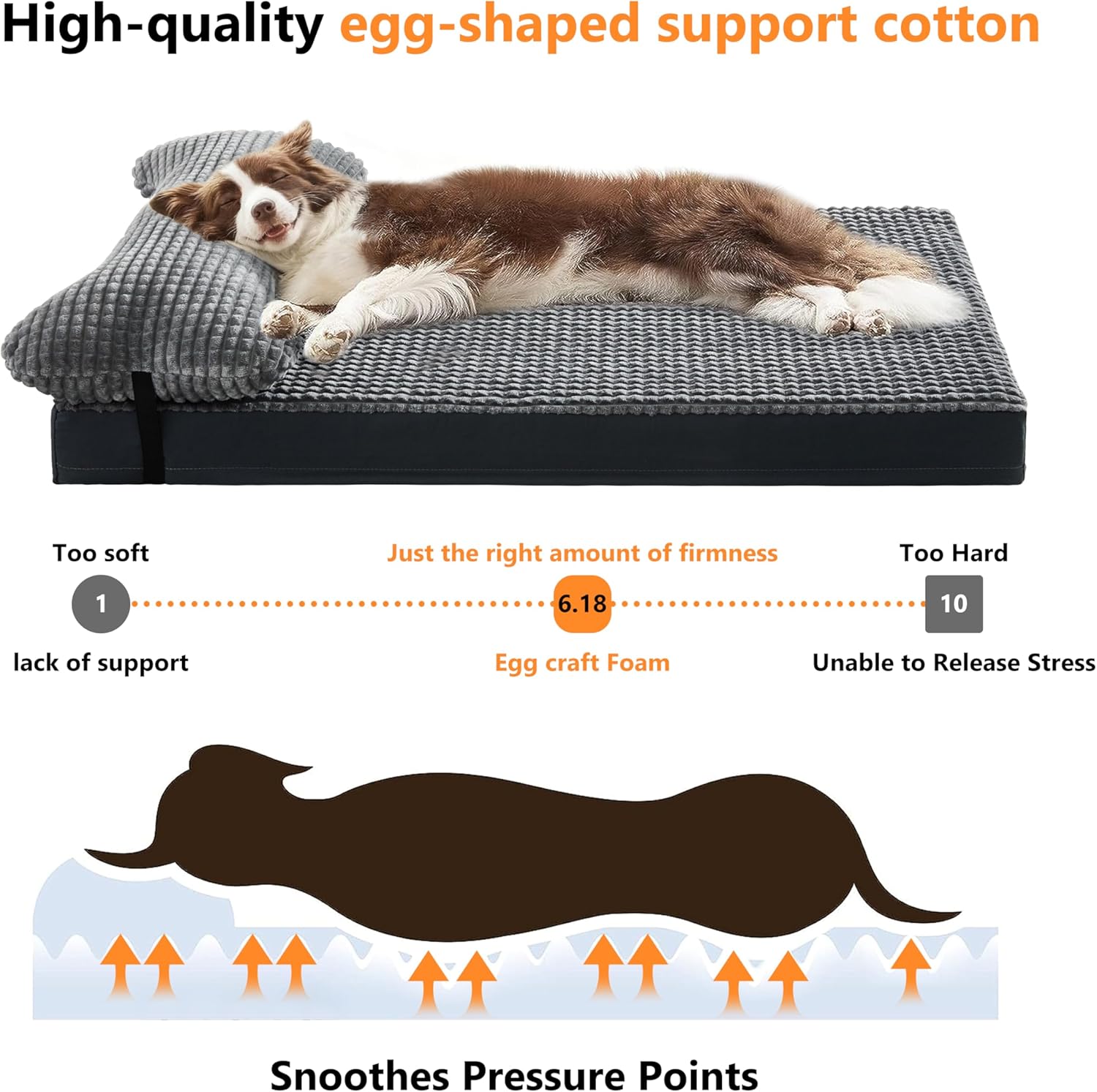 Egg-Shaped Support Cushion <p class="a-size-small"> Engineered with an egg-shaped support pad, this bed delivers ideal medium-firm comfort—not too soft, not too hard—for a more restful sleep. </p>