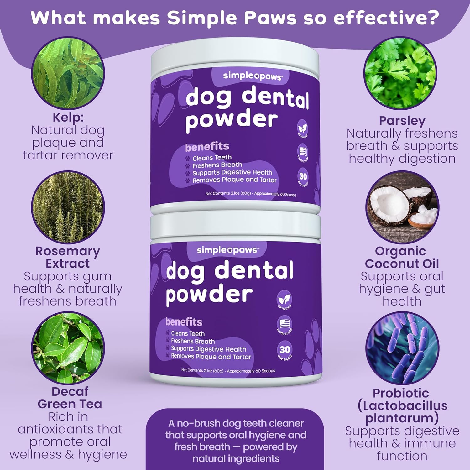 <br> Product Dimensions : 3 x 3 x 3.25 inches; 3.21 ounces <br> Item model number : SP-DP-60 <br> Date First Available : September 28, 2025 <br> Manufacturer : Simple Paws <br> ASIN : B0FSYPX2PL <br> Best Sellers Rank: #24,437 in Pet Supplies (See Top 100 in Pet Supplies) #177 in Dog Dental Care <br> Customer Reviews: 4.5 4.5 out of 5 stars (33) var dpAcrHasRegisteredArcLinkClickAction; P.when('A', 'ready').execute(function(A) { if (dpAcrHasRegisteredArcLinkClickAction !== true) { dpAcrHasRegisteredArcLinkClickAction = true; A.declarative( 'acrLink-click-metrics', 'click', { "allowLinkDefault": true }, function (event) { if (window.ue) { ue.count("acrLinkClickCount", (ue.count("acrLinkClickCount") || 0) + 1); } } ); } }); P.when('A', 'cf').execute(function(A) { A.declarative('acrStarsLink-click-metrics', 'click', { "allowLinkDefault" : true }, function(event){ if(window.ue) { ue.count("acrStarsLinkWithPopoverClickCount", (ue.count("acrStarsLinkWithPopoverClickCount") || 0) + 1); } }); }); <br>Dental powder for dogs teeth – daily dog dental powder for teeth cleaning that helps reduce plaque and tartar for a healthier smile. Studies show regular dental care can add 2–4 years to a dog’s life, giving you more happy years together.<br>No more brushing battles – this easy dog teeth cleaning powder works as a gentle alternative to a dog tooth brushing kit or complicated dog teeth cleaning kit. Keep their teeth clean without stress, so you can enjoy more cuddles and kisses.<br>End embarrassing breath – this natural bad dog breath treatment works as a safe dog breath freshener and reliable bad breath treatment for dogs. Enjoy close moments again knowing their kisses are fresh, not smelly.<br>Protect their health – consistent use supports complete dog dental care and works as a natural dog plaque and tartar remover and gentle dog tarter remover alternative. Over 80% of dogs show signs of dental issues by age 3, and regular care helps avoid painful procedures and expensive cleanings through simple daily prevention.<br>Made in USA – an all-natural, chicken-flavored powder with probiotics for digestion, immunity, and oral wellness. Unlike harsh rinses or enzymatic toothpaste for dogs, this safe formula gives you peace of mind, a healthier dog, and long-lasting results.