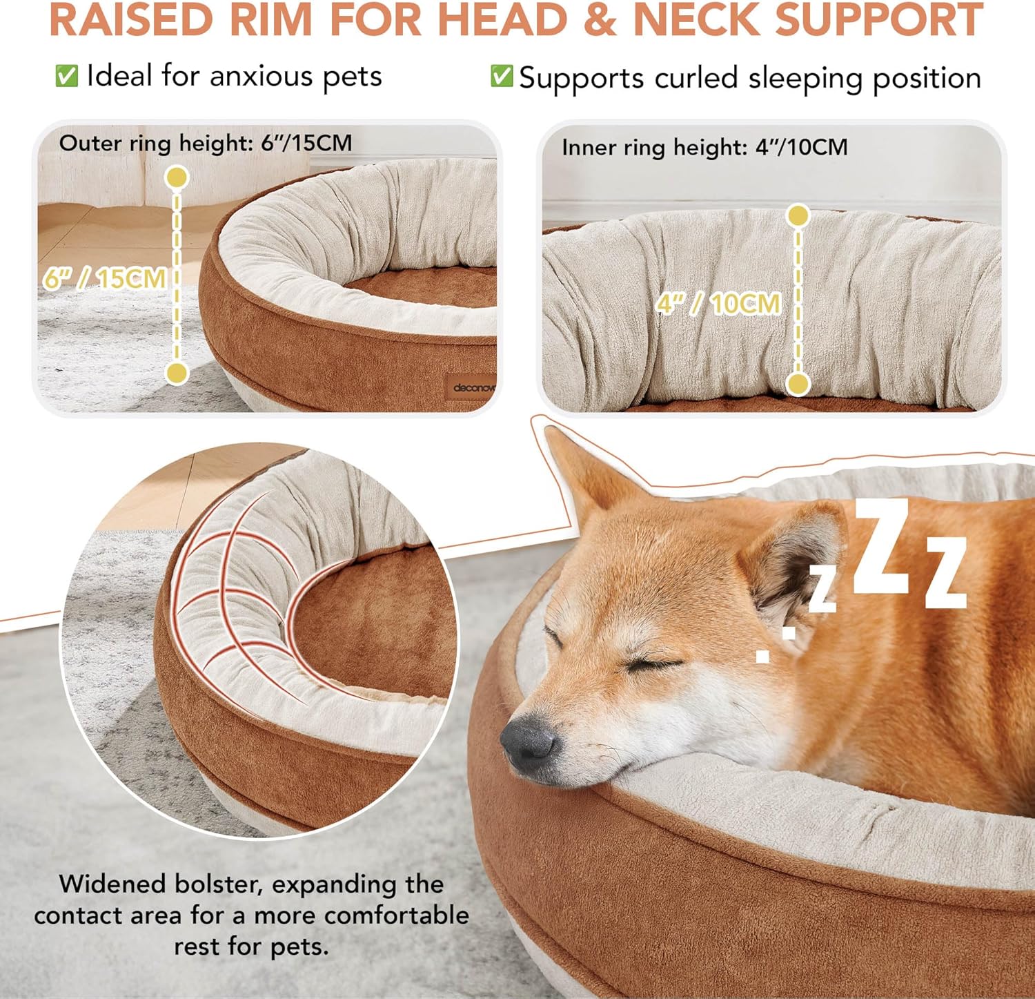 <br> Product Dimensions : 20 x 20 x 6 inches; 4.12 Pounds <br> Date First Available : January 30, 2025 <br> Manufacturer : Deconovo <br> ASIN : B0DFM3ZVJS <br> Best Sellers Rank: #126,062 in Pet Supplies (See Top 100 in Pet Supplies) #1,623 in Dog Beds <br> Customer Reviews: 4.2 4.2 out of 5 stars (13) var dpAcrHasRegisteredArcLinkClickAction; P.when('A', 'ready').execute(function(A) { if (dpAcrHasRegisteredArcLinkClickAction !== true) { dpAcrHasRegisteredArcLinkClickAction = true; A.declarative( 'acrLink-click-metrics', 'click', { "allowLinkDefault": true }, function (event) { if (window.ue) { ue.count("acrLinkClickCount", (ue.count("acrLinkClickCount") || 0) + 1); } } ); } }); P.when('A', 'cf').execute(function(A) { A.declarative('acrStarsLink-click-metrics', 'click', { "allowLinkDefault" : true }, function(event){ if(window.ue) { ue.count("acrStarsLinkWithPopoverClickCount", (ue.count("acrStarsLinkWithPopoverClickCount") || 0) + 1); } }); }); <br>Comfort Redefined for Small Dogs: Give your pup the gift of deep sleep. This calming donut bed wraps them in a cozy circle of plush softness and orthopedic egg crate foam.<br>Easy to Clean, Made to Last: You can just unzip the cover and toss it in the wash. Designed with a durable anti-tear zipper and removable cover for stress-free maintenance.<br>Built-In Waterproof Protection: The entire surface is treated with TPU waterproofing to shield your floors from accidents and keep things fresh.<br>Non-Slip Base for Urban Living: No more skidding across tile or hardwood. The anti-slip bottom keeps the bed secure—perfect for compact spaces or crate use.<br>Modern Design That Matches Your Style: A sleek neutral tone fits effortlessly into your home. It’s not just a pet bed—it’s a decor piece.