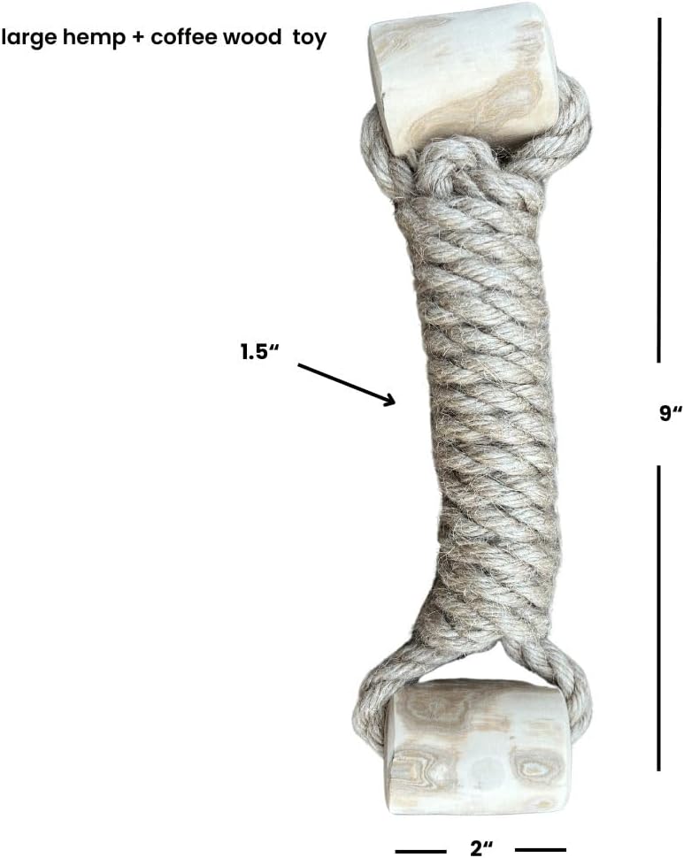 Our hemp rope and coffee wood dog toy is designed to engage your pup in interactive play using only natural materials. Made from 100% biodegradable hemp rope and real coffee wood, this natural hemp rope toy provides an eco-conscious alternative to plastic-based or synthetic dog toys. Free from added dyes or artificial materials, it supports simple, natural playtime. The textured hemp rope offers a satisfying chewing experience, while the smooth coffee wood component is designed to gradually wear down over time with normal use. This natural hemp rope is a great option for pet owners who prefer toys made with minimal processing and plant-based materials. Always supervise your pet during play and replace the toy when worn.