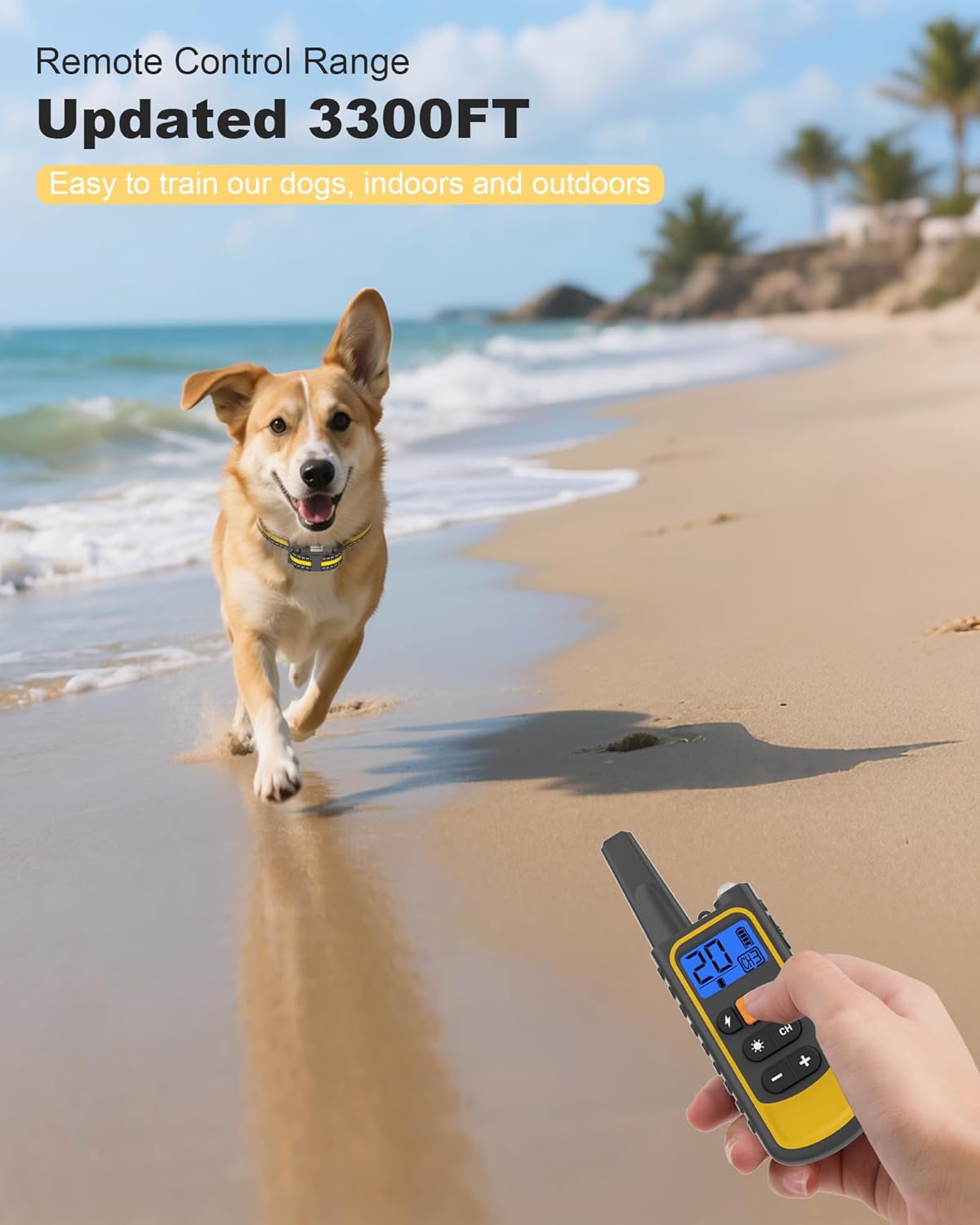 【3300FT Range with Multi-Channel Support】With a remote range of up to 3300FT, this collar allows freedom for your dog while maintaining control during training, indoors or outdoors. The multi-channel design supports training three dogs at once, and the memory function saves your last settings without needing to reset.