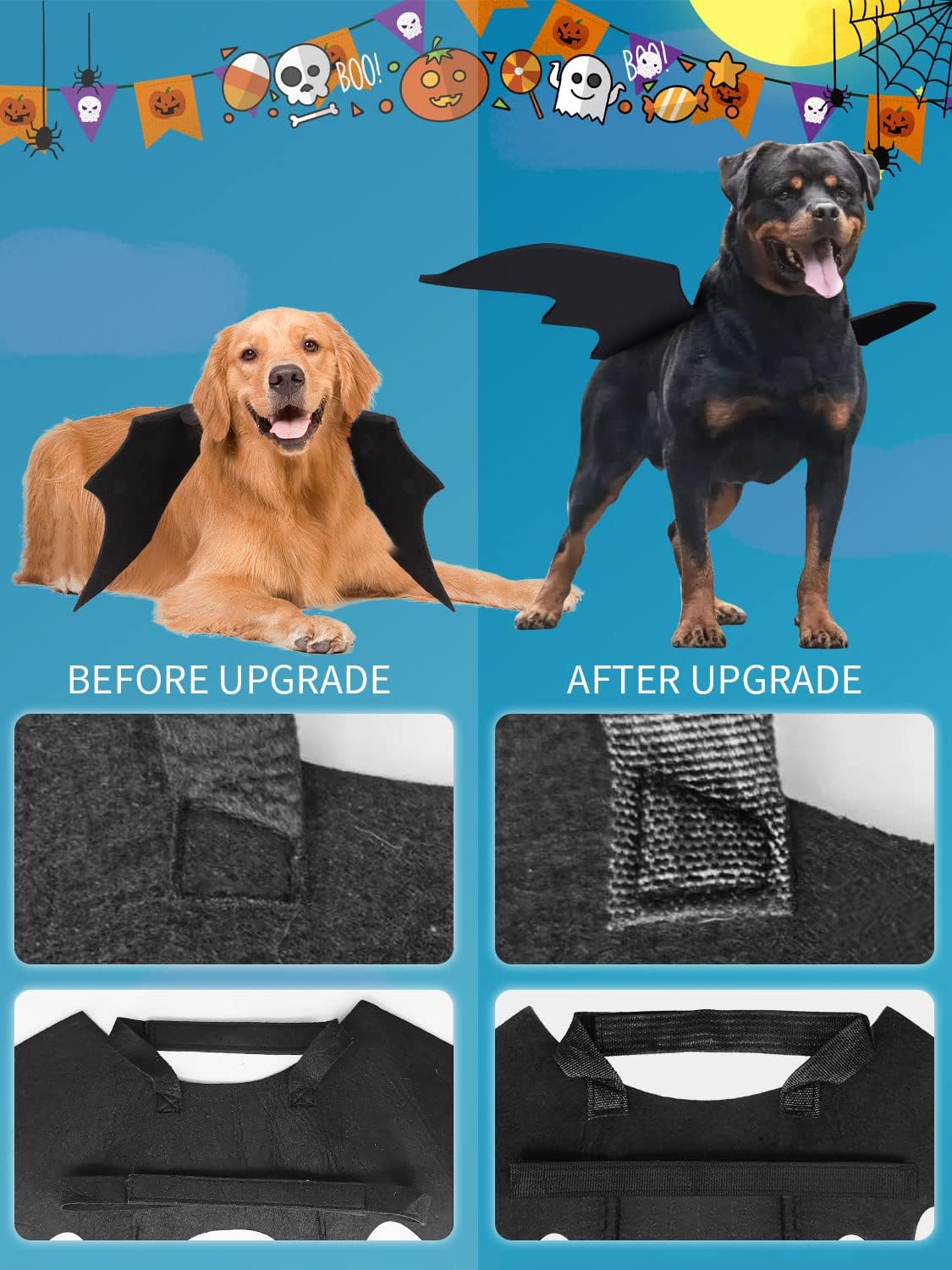 NEW UPGRADE: This bat wing made of higher quality felt with a thickness of 5mm, which always keeps flying posture without sagging. The straps made of nylon material, which is tougher. Sewing area of contact point between straps and wings is increased to prevent falling off. A extra pull ring is added to back of the bat wings for attaching dog leash. Not a cheaply made.