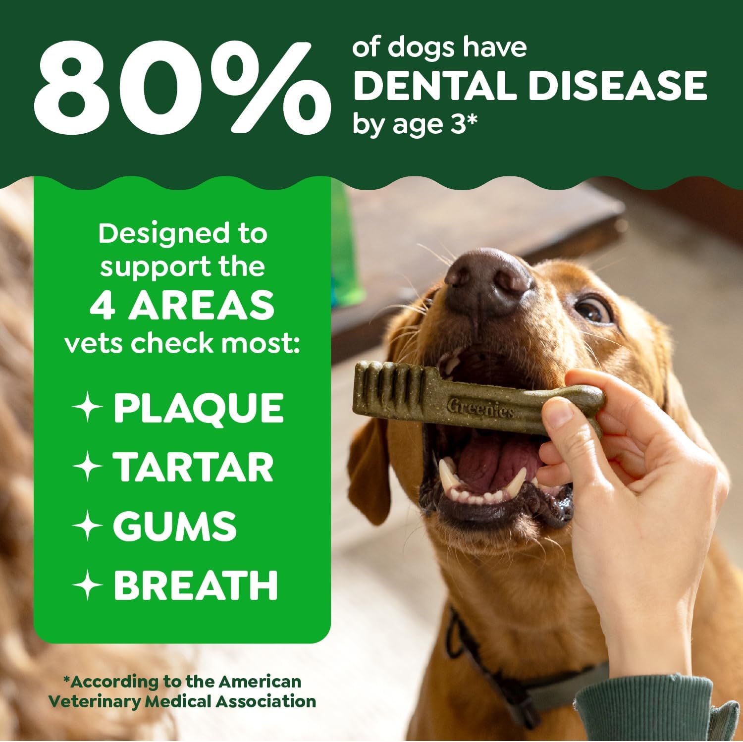 80% of dogs have dental disease by the age of 3, according to the American Veterinary Medical Association. Start your puppy off with a healthy habit with Greenies Dental Puppy Treats. These veterinarian-recommended dental treats for dogs are crafted to support the 4 areas veterinarians check most: plaque, tartar, gums, & breath, keeping pet owners who are interested in proactive pet care confident about daily puppy dental care. Your pup can’t wait to sink their teeth into these delicious dog dental chews that help keep their teeth clean and breath fresh. These dog chews have a unique design that works like a toothbrush to clean down to the gumline to support dog dental care at home, remaining capable of plaque reduction and tartar control. These chewy dog treats are made with natural ingredients plus vitamins, minerals & nutrients. Made for a puppy 6 months+ between 5-15 lbs., these small dog dental chews are crafted with DHA to support brain development and are made with calcium to support strong teeth and healthy jaws. Greenies dental chews for dogs are a safe way to treat your puppies because they’re rawhide-free, easy to chew and digest, and bendable – won’t snap. Your little furry friend will love these irresistible, mouth-wowing dog treats that promote oral health. Make Health A Treat!