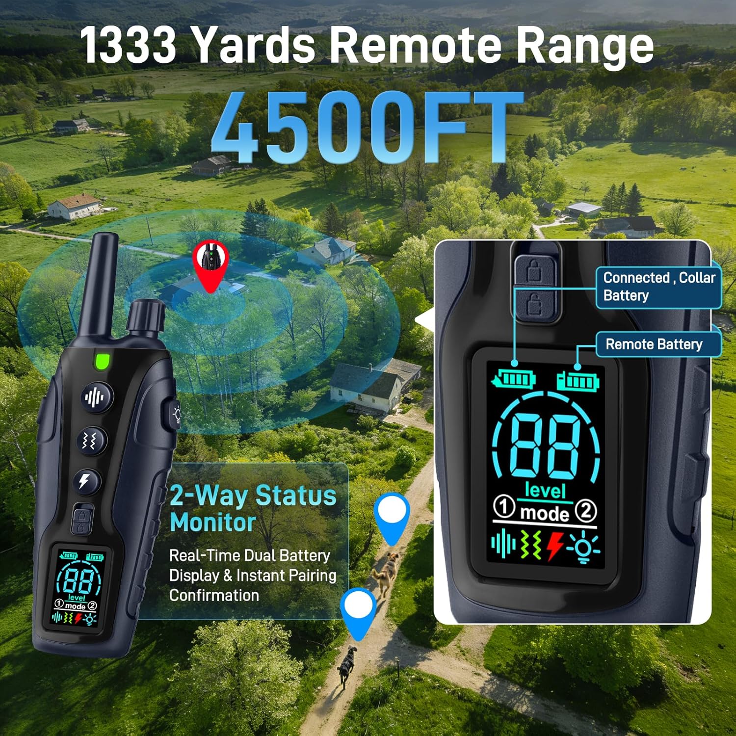 <br> Product Dimensions : 8.46 x 4.72 x 2.16 inches; 14.89 ounces <br> Item model number : RS3 <br> Batteries : 2 Lithium Polymer batteries required. <br> Date First Available : October 14, 2022 <br> Manufacturer : Shenzhen Smartpet Technology Co., Ltd. <br> ASIN : B0BJ6W266S <br> Best Sellers Rank: #5,160 in Pet Supplies (See Top 100 in Pet Supplies) #25 in Electronic Training Collars <br> Customer Reviews: 4.3 4.3 out of 5 stars (3,975) var dpAcrHasRegisteredArcLinkClickAction; P.when('A', 'ready').execute(function(A) { if (dpAcrHasRegisteredArcLinkClickAction !== true) { dpAcrHasRegisteredArcLinkClickAction = true; A.declarative( 'acrLink-click-metrics', 'click', { "allowLinkDefault": true }, function (event) { if (window.ue) { ue.count("acrLinkClickCount", (ue.count("acrLinkClickCount") || 0) + 1); } } ); } }); P.when('A', 'cf').execute(function(A) { A.declarative('acrStarsLink-click-metrics', 'click', { "allowLinkDefault" : true }, function(event){ if(window.ue) { ue.count("acrStarsLinkWithPopoverClickCount", (ue.count("acrStarsLinkWithPopoverClickCount") || 0) + 1); } }); }); <br>【Dog Training Collar with Flash Light】Two light modes of solid white light & flashing lights on receiver collar,which is super awesome for camping or night walks to keep track of the dog , just remotely turn the light on makes it easy to spot your dog,it is decently bright which makes it easy to spot your dog from a far distance even in the woods.if you dog like to take off into the woods at night,or love to hide at pee time before bed,this collar will super helpful for you.the product is suitable for dogs 20-150LB<br>【Beep and Vibration Function Can Correct Most of Your Dog's Bad Habits】we are equipped with a unique sound pitch adjustable function(1-8 levels),the change of sound frequency can better attract the dog's attention to recognizes different warning tones,high-intensity vibration function (1-16 levels) can also give the dog a more powerful warning,(1-99 level) function for more stubborn dogs<br>【4500FT Range & 2-Way Status Monitor】This training collar offers 4500FT range, letting pups roam free in backyards, parks or trails—seamless training indoors & outdoors. Unlike one-way trainers, our 2-Way Monitor links live to the collar, showing real-time remote and collar battery levels on-screen. Dual battery icons confirm pairing instantly, eliminating mid-adventure power anxiety and ensuring every one-click command works reliably.<br>【Long Battery Life Rechargeable Bark Collar Waterproof】 Dog training collar can be recharged within 2 hours by phone adapter and USB outlet of the PC/power bank/car, the dog collar can last up to 35 days of standby time and the remote 45 days,the screen can display both power levels of the remote control and receiver.IP67 waterproof collar is convenient for dogs playing around a pool or in the rain freely,the remote transmitter is not waterproof<br>【Keypad Lock to Prevent False Triggering】This dog collar has independent and clear function buttons, easy to use helping you to teach a dog basic obedience commands and solve an uncontrollable dog's behavior like being a bark collar for your dog,the keypad lock can significantly prevents any accidental push while carrying the remote control.if the dog has long and thick fur, please use long prongs