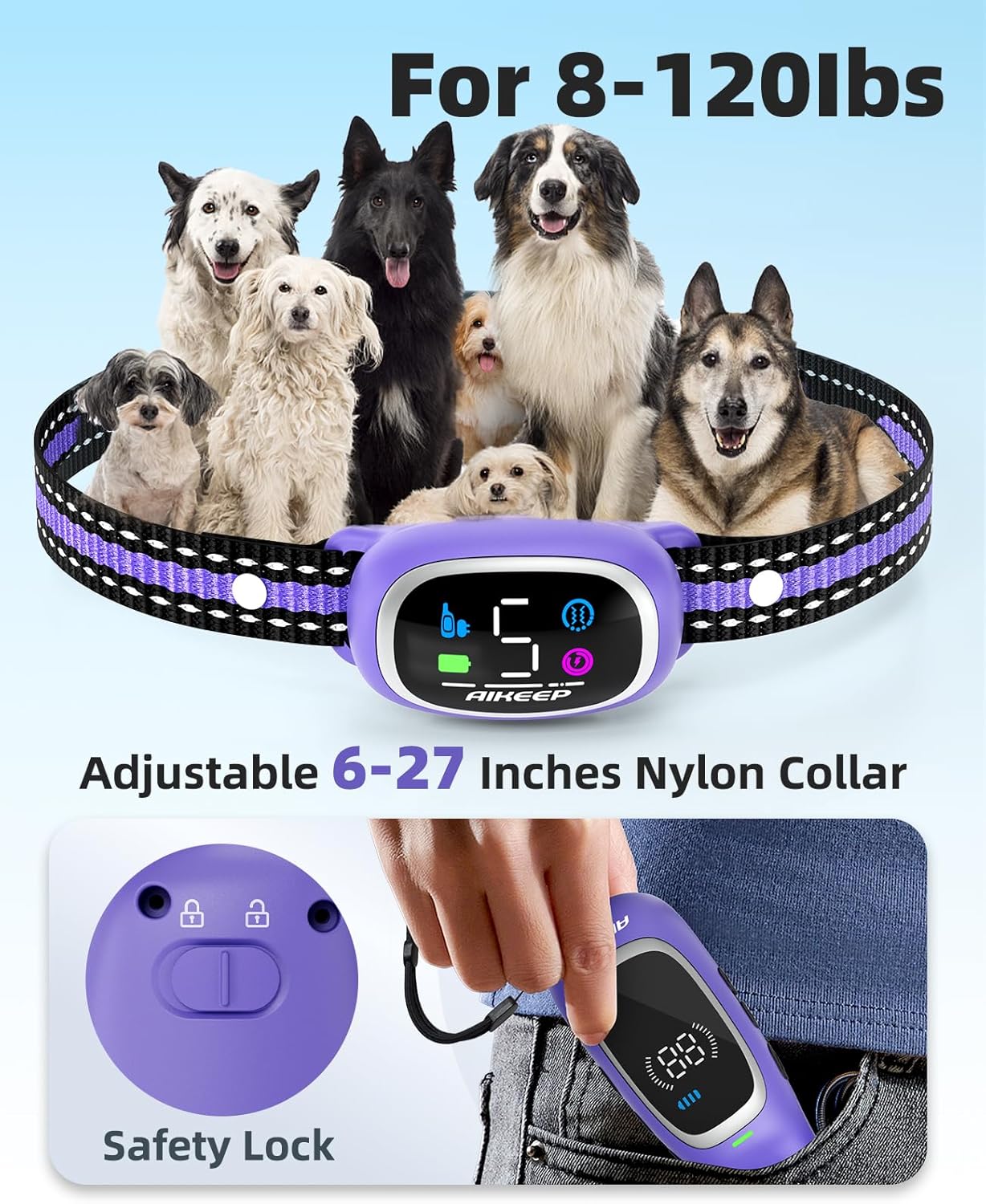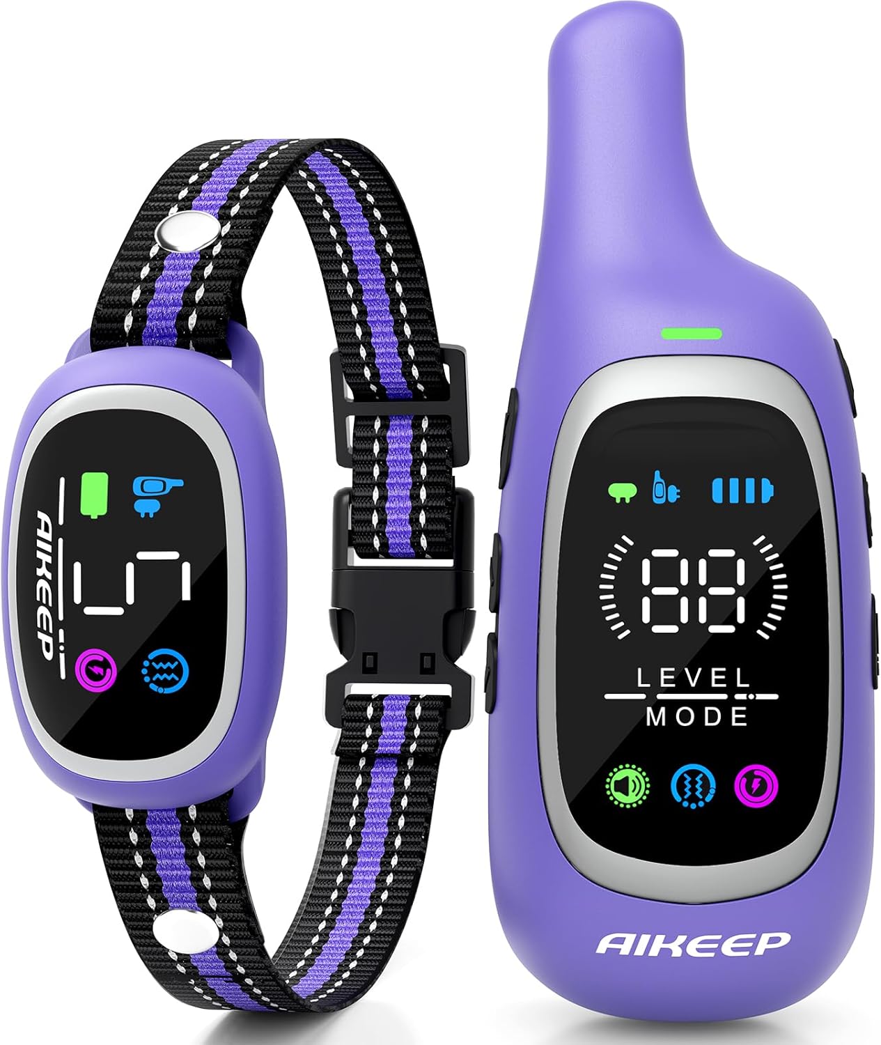 <br> Package Dimensions : 6.73 x 5.75 x 1.73 inches; 11.68 ounces <br> Item model number : OTB3 <br> Batteries : 2 Nonstandard Battery batteries required. (included) <br> Date First Available : May 12, 2025 <br> Manufacturer : AIKEEP <br> ASIN : B0DZXJ7KBR <br> Best Sellers Rank: #4,412 in Pet Supplies (See Top 100 in Pet Supplies) #24 in Electronic Training Collars <br> Customer Reviews: 4.2 4.2 out of 5 stars (857) var dpAcrHasRegisteredArcLinkClickAction; P.when('A', 'ready').execute(function(A) { if (dpAcrHasRegisteredArcLinkClickAction !== true) { dpAcrHasRegisteredArcLinkClickAction = true; A.declarative( 'acrLink-click-metrics', 'click', { "allowLinkDefault": true }, function (event) { if (window.ue) { ue.count("acrLinkClickCount", (ue.count("acrLinkClickCount") || 0) + 1); } } ); } }); P.when('A', 'cf').execute(function(A) { A.declarative('acrStarsLink-click-metrics', 'click', { "allowLinkDefault" : true }, function(event){ if(window.ue) { ue.count("acrStarsLinkWithPopoverClickCount", (ue.count("acrStarsLinkWithPopoverClickCount") || 0) + 1); } }); }); <br>Shock Collar & Bark Collar 2 in 1– AIKEEP collar combo offers 3 modes: Shock collar mode(8 beep, 16 vibration, 99 shock), bark collar mode(5 sensitivity levels), and Combined mode. Shock collar helps correct unwanted behaviors, like barking, jumping, while bark collar mode automatically detects barking and responds accordingly.<br>Extended 3300FT Remote Range & Stable Signal– With an ultra-long 3300FT range and stable signal, this dog training collar with remote ensures uninterrupted training across yards, parks, and open fields.<br>IP67 Waterproof e collar – Train Anytime, Anywhere – With an IP67 waterproof rating, this dog bark collar and shock collar for dogs allows your dog to train in the rain, swim, or even roll in mud.<br>Fast Charging & Long Battery Life – with a high-capacity rechargeable battery, the dog shock collar receiver lasts 15+ days and the remote lasts 30+ days on a single 2-hour charge.<br>Adjustable Nylon Collar & Safety Lock – Designed with a secure safety lock button to prevent accidental operation, and a soft, adjustable nylon strap (6-27 inches), this dog shock collar with remote control provides a comfortable fit for small, medium, and large dogs (8-120lbs).<br>Effortless Training with LED Display – This electric dog collar and anti bark collar for dogs features a large, backlit LED screen for clear visibility in low light. Intuitive, one-hand controls make it perfect for first-time pet owners, offering a stress-free, simple training experience for you and your dog.<br>Note:The collar strap is adjustable from 6 to 27 inches and can be trimmed to fit your dog’s neck size. To prevent fraying after cutting, please use a lighter to carefully singe the cut end of the strap.<br>Before using the product, we kindly recommend that you read the user manual thoroughly and watch the instructional videos carefully to ensure proper setup and safe, effective use.