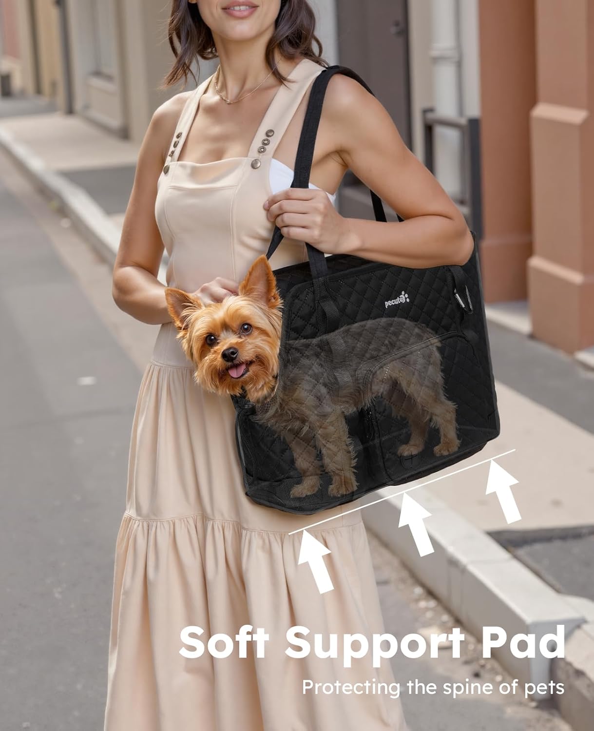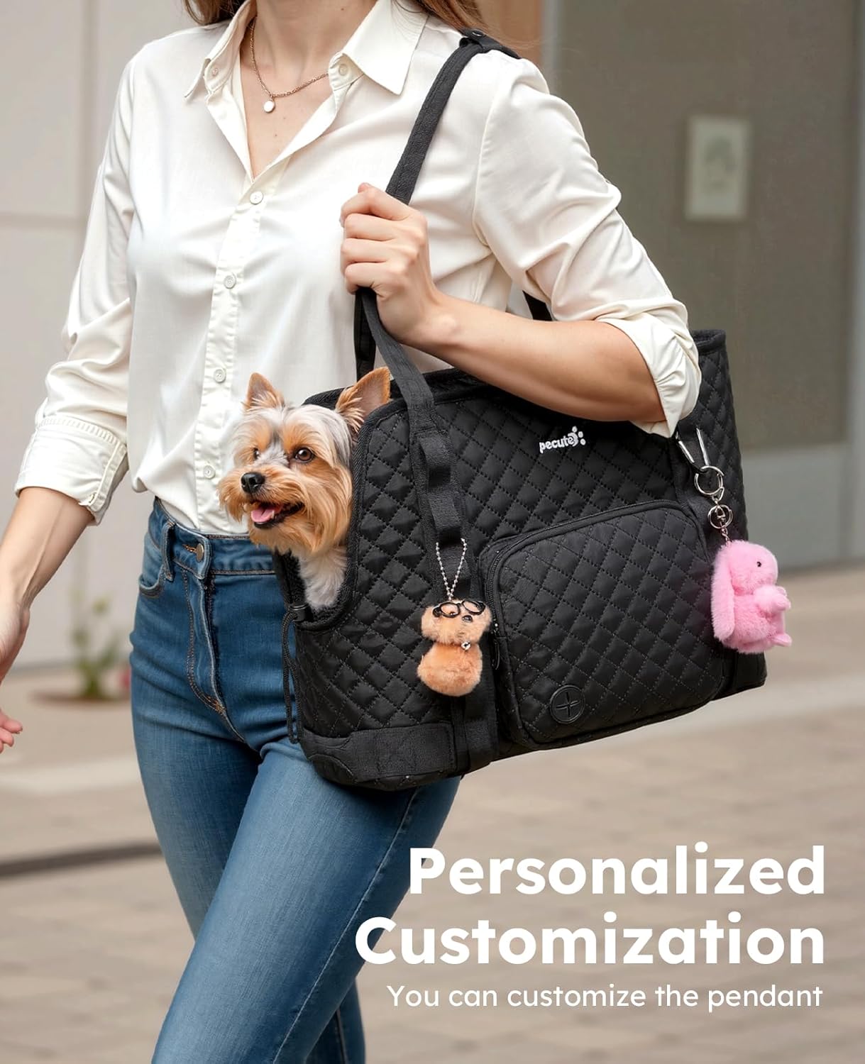<br> Product Dimensions : 15.21 x 7.41 x 11.7 inches; 1.1 Pounds <br> Item model number : PC-PP01 <br> Department : Womens Mens <br> Date First Available : October 10, 2024 <br> Manufacturer : Pecute <br> ASIN : B0DJQDZBCL <br> Best Sellers Rank: #19,388 in Pet Supplies (See Top 100 in Pet Supplies) #3 in Dog Carrier Purses <br> Customer Reviews: 4.5 4.5 out of 5 stars (540) var dpAcrHasRegisteredArcLinkClickAction; P.when('A', 'ready').execute(function(A) { if (dpAcrHasRegisteredArcLinkClickAction !== true) { dpAcrHasRegisteredArcLinkClickAction = true; A.declarative( 'acrLink-click-metrics', 'click', { "allowLinkDefault": true }, function (event) { if (window.ue) { ue.count("acrLinkClickCount", (ue.count("acrLinkClickCount") || 0) + 1); } } ); } }); P.when('A', 'cf').execute(function(A) { A.declarative('acrStarsLink-click-metrics', 'click', { "allowLinkDefault" : true }, function(event){ if(window.ue) { ue.count("acrStarsLinkWithPopoverClickCount", (ue.count("acrStarsLinkWithPopoverClickCount") || 0) + 1); } }); }); <br>Kind tips:Dimensions: 15.21*11.7*7.41 inches. Suitable for dogs within 9LBS (4KG). If you want to expose the dog's head, dogs between 5-9LBS are more suitable.For breathability, this dog purse has a partially closed top. It's not recommended if your puppy is very active and doesn't like staying in a bag.Included items: dog purse carrier bag, climbing port<br>【LIGHTWEIGHT,PORTABLE】: This dog purse carrier is designed to be incredibly lightweight, weighing just 1.54lbs(700g). Dog bag carrier compact design makes it easy to carry, fitting comfortably under your arm or in your hand – ideal for quick vet visits or leisurely park strolls<br>【SAFE,STABLE】: The dog carrier bag includes a built-in safety cord prevents your pet from escaping. Zip the top shut to give your dog a sense of security.The removable hard bottom board with plush fur provides a stable activity environment and a soft feel for dogs<br>【CONVENIENT,STORAGE】: The Dog tote bag has two storage pockets, and the front pocket allows for easy access to snacks, trash bags, mobile phones, lipsticks and other items.The back zipper pocket can be used as a suitcase in addition to storing items<br>【WASHABLE,INTIMATE】: Please remove the bottom plate before washing (Note: machine washing may cause deformation of the dog carrier purse).The molar strap system and carabiner allow pet toys, foldable water bowls or other items to be hung<br>【BEAUTIFUL,DETAILED】: The retro and fashionable diamond grid design is not only a pet transport tool, but also a fashionable item for traveling.The bottom of the dog carrier purse is designed with a foot pad to prevent dirt and damage to the bottom and extend its service life