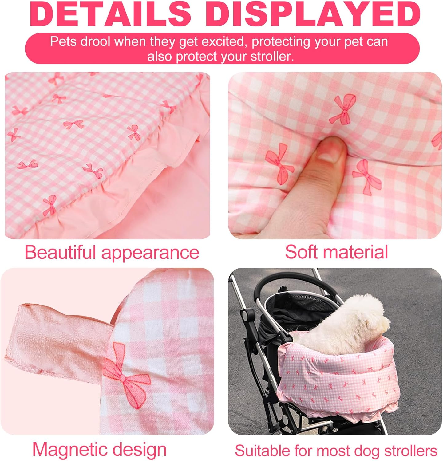 <br> Product Dimensions : 8 x 5 x 2 inches; 9.6 ounces <br> Date First Available : June 3, 2024 <br> Manufacturer : LUKHMELF <br> ASIN : B0D5Y3HRZL <br> Best Sellers Rank: #126,288 in Pet Supplies (See Top 100 in Pet Supplies) #262 in Dog Strollers <br> Customer Reviews: 3.6 3.6 out of 5 stars (26) var dpAcrHasRegisteredArcLinkClickAction; P.when('A', 'ready').execute(function(A) { if (dpAcrHasRegisteredArcLinkClickAction !== true) { dpAcrHasRegisteredArcLinkClickAction = true; A.declarative( 'acrLink-click-metrics', 'click', { "allowLinkDefault": true }, function (event) { if (window.ue) { ue.count("acrLinkClickCount", (ue.count("acrLinkClickCount") || 0) + 1); } } ); } }); P.when('A', 'cf').execute(function(A) { A.declarative('acrStarsLink-click-metrics', 'click', { "allowLinkDefault" : true }, function(event){ if(window.ue) { ue.count("acrStarsLinkWithPopoverClickCount", (ue.count("acrStarsLinkWithPopoverClickCount") || 0) + 1); } }); }); <br>High-quality material: This dog stroller mat is made of premium cotton, with a soft, breathable, and comfortable texture that will make your pet feel cozy when resting their face on the front of the cart. It protects your pet from rough surfaces and sharp edges, and we believe both you and your pet will really dig it!<br>Beautiful appearance: The design of this pet stroller front pad is super cute, decorated with a pink bow, enhancing your pet's overall look. The lovely colors can boost your pet's happiness, making it an ideal choice for both pet and owner.<br>Easy to Attach: This pet stroller cushion utilizes a magnetic design, eliminating the need for specific tie positions or buckles. Each corner of the cushion is equipped with magnets, making it convenient to attach directly to the stroller. This design is compatible with a wider variety of dog strollers. The high-strength magnets provide sufficient holding power, effectively preventing slipping or falling. This is particularly important for pets that need to be in the stroller for extended periods, as it can significantly reduce their discomfort.<br>Convenient to carry: Easy to fold, doesn't take up much space, making it super convenient for storage and portability.<br>Pet stroller front section guard: Suitable for use with most pet stroller frames, as the corners of these strollers can be too hard and might harm your pet's chin or body. This pad effectively prevents such incidents, making it a crucial accessory for both pets and owners.