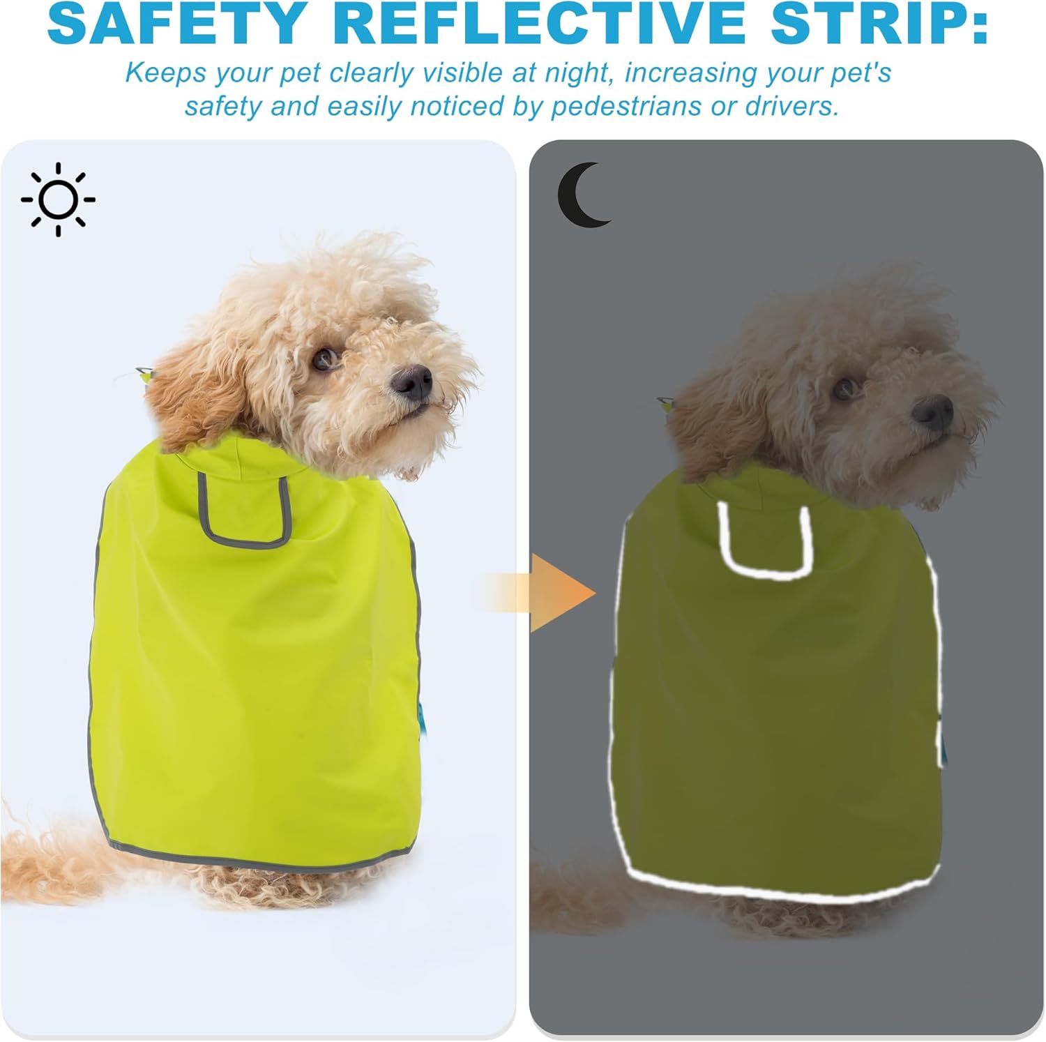 Features: Enhanced safety with bright reflective strips on the front, back, and rear of the puppy raincoat.Adjustable elastic waistband ofdog umbrella for a tailored fit and comfortable movement.A hidden leash hole at the back ensures additional control without hindering vision on a waterproof dog jacket.Premium PU fabric provides waterproof, breathable, and odor-free protection onsmall dog raincoats waterproof.Lightweight design for easy wear, cleaning, and storage convenience of dog Raincoat. Specification: Color: YellowMaterial: PolyurethaneBack Length:33cm/ 13"Neck Girth: 37cm/ 14.57"Brisket Girth:47cm/ 18.50" Package List: 1 Pcs Dog Raincoat Note: Measure your dog accurately before purchasing to ensure the raincoat fits properly.