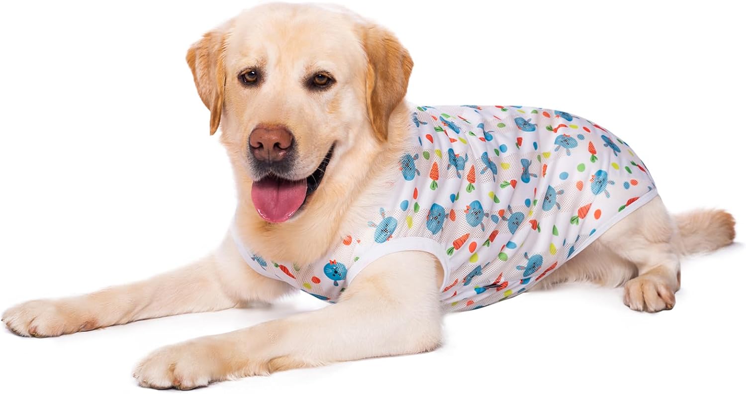 <br> Package Dimensions : 4 x 1 x 0.1 inches; 1.6 ounces <br> Item model number : MAJ230531002BR_5XL <br> Date First Available : March 11, 2024 <br> Manufacturer : HDKUW <br> ASIN : B0CXPPQD3D <br> Best Sellers Rank: #96,305 in Pet Supplies (See Top 100 in Pet Supplies) #624 in Dog Shirts <br> Customer Reviews: 4.3 4.3 out of 5 stars (58) var dpAcrHasRegisteredArcLinkClickAction; P.when('A', 'ready').execute(function(A) { if (dpAcrHasRegisteredArcLinkClickAction !== true) { dpAcrHasRegisteredArcLinkClickAction = true; A.declarative( 'acrLink-click-metrics', 'click', { "allowLinkDefault": true }, function (event) { if (window.ue) { ue.count("acrLinkClickCount", (ue.count("acrLinkClickCount") || 0) + 1); } } ); } }); P.when('A', 'cf').execute(function(A) { A.declarative('acrStarsLink-click-metrics', 'click', { "allowLinkDefault" : true }, function(event){ if(window.ue) { ue.count("acrStarsLinkWithPopoverClickCount", (ue.count("acrStarsLinkWithPopoverClickCount") || 0) + 1); } }); }); <br>[Size]: 5XL:Chest Girth:34.6",Back Length:27.6",Neck Girth:20.5" .Recommended weight for 66-88LB Large dogs.Such as Samoyed,Alaskan Malamute,Beagle and so on.If there is a difference between the neck and the chest, follow the chest size.<br>[Material]: Our dog t shirt is made of breathable polyester fabric. The mesh vest design is comfortable and breathable, bringing a comfortable wearing experience for your pets, soft, lightweight, cool and comfortable to wear in the hot summer.<br>[Design]: Comes in stylishsheep, dinosaur, rainbow,donut pattern printed design, fashion and adorable. Bright color and breathable material, make your pet looks more popular and feel cool, comfortable to wear it.<br>[Durable]: Strong prints will not be damaged and disappear after many times of washing. Medium and large-sized dogs are wearing the onesie clothes which still are so soft and like new.<br>[Suitable]: Suit for Puppy, medium dogs and large dogs, perfect for daily wear, walking, jogging, sleeping and photos. You can also give it as a gift to your friends who have a dogs.