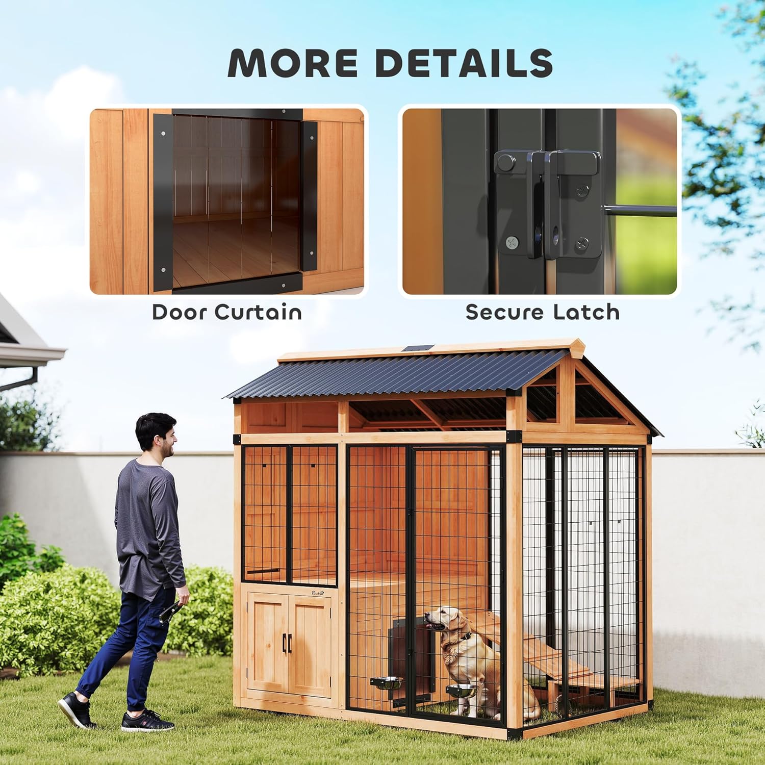 <br> Product Dimensions : 64.2 x 84.6 x 87.2 inches; 287 Pounds <br> Item model number : D02-256V00YL <br> Date First Available : December 11, 2025 <br> Manufacturer : Aosom LLC <br> ASIN : B0G6KDJS7Y <br> Best Sellers Rank: #120,550 in Pet Supplies (See Top 100 in Pet Supplies) #252 in Dog Houses <br>Spacious Walk-In Design: This extra-large dog house gives your pup ample space to rest, play, and stretch, letting them feel at home without cramping. Its 87.2" height and 61" door let you easily enter for cleaning and daily interaction.<br>Multi-Zone Living: Featuring an enclosed sleeping room plus an elevated outdoor platform connected by stairs, this design offers shade and sunshine. The Plastic door curtain adds extra protection, creating a cozy semi-outdoor retreat year-round.<br>External Storage Cabinet: This outdoor dog house includes a spacious storage cabinet for food, toys, and leashes. It keeps essentials within reach while maintaining a neat, organized outdoor space for convenient use and a clean backyard.<br>Adjustable Feeding System: Equipped with two 0.3 gal stainless-steel bowls and an adjustable rack, the dog house allows you set the suitable height for your dog, supporting neck health and comfortable digestion.<br>Robust and Long-Lasting: This dog house features reinforced steel mesh to prevent large dogs from escaping or causing damage. Built with fir wood treated with a coating and a waterproof plastic roof, it provides strong, year-round shelter for your pet.