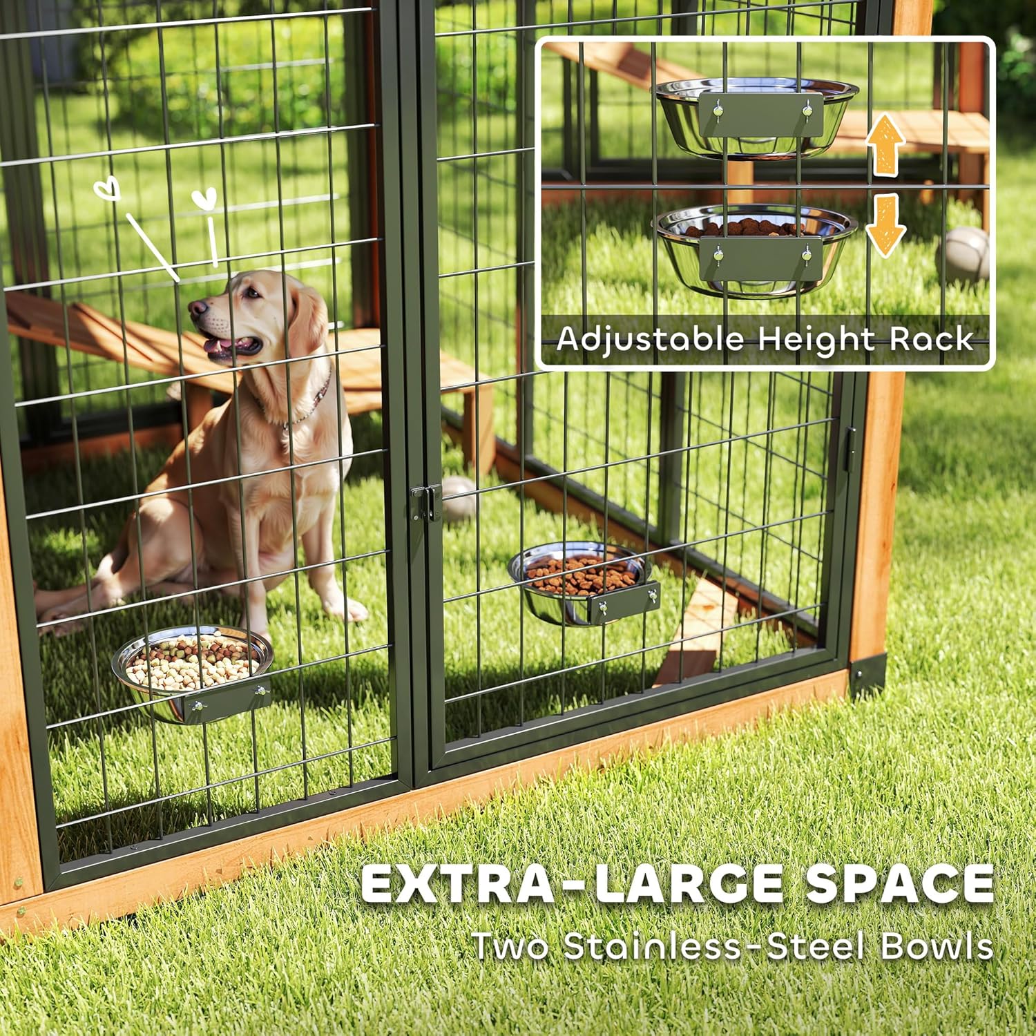 The spacious area gives large dogs ample room to freely play A tall walk-in design with a large door allows for easy cleaning Includes a large built-in cabinet to keep your yard tidy and organized Dual-zone layout offers both a sheltered room and an open-air area Height-adjustable steel bowls promote comfort during mealtime Heavy-duty wire mesh prevents escapes and preserves your peace of mind Weatherproof fir wood and plastic roof offers a safe sanctuary Assembly required