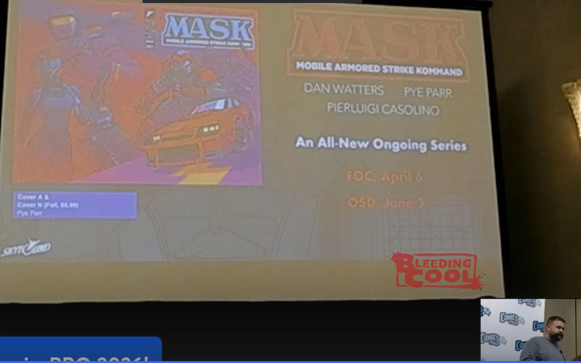 “It’s finally time for M.A.S.K. in the Energon universe. We got Dan Watters writing and Pye Parr drawing the book. It’s a new ongoing series. It’s gonna be out in June. FOC is in April. That’s all I’ve read from the slide. We’re expanding the universe very deliberately, very slowly, making sure that the line can sustain itself for as long as we want to do it. And M.A.S.K. is a book that’s going to add a lot of really great stuff to the universe and really allow the books to interact in a way that they haven’t before. We’re really excited about the future of the Energon Universe. Let’s do well, and I think it’s only gonna do better. And Arune has a presentation after this, we’re gonna talk about some more details about M.A.S.K. that are super, super cool.”