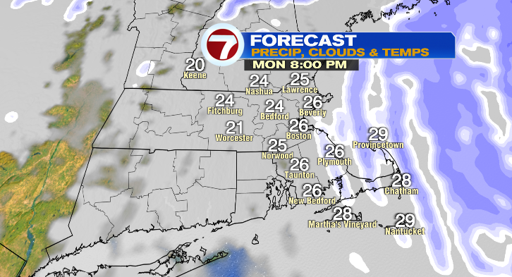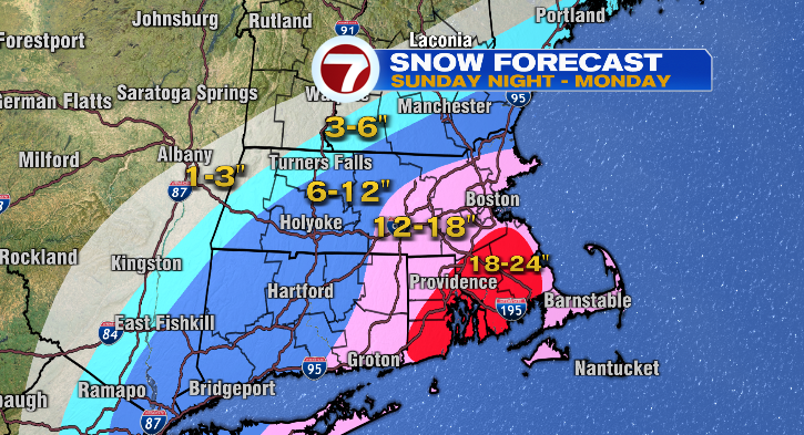 Snowfall totals! This is a coastal storm, so the highest amounts will be across southeastern Massachusetts where we could pick up up to 2 feet of snow. Right along the coast in Plymouth County, slightly less since the wind will have an effect on the snowflakes.