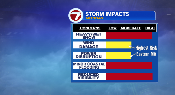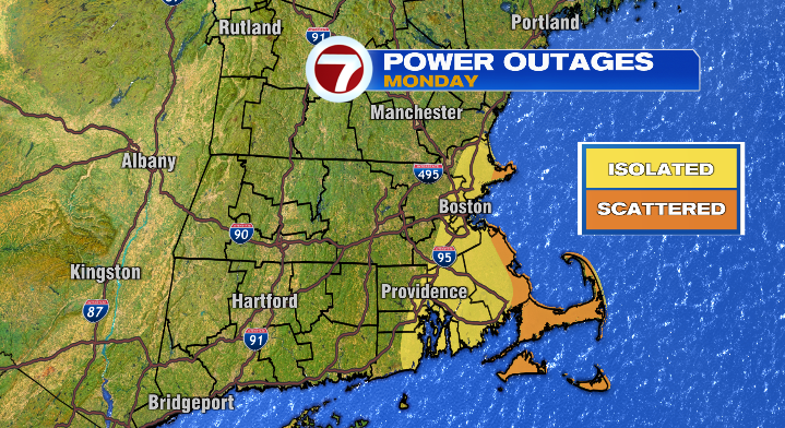 The peak wind gusts along the coastline in southeastern Massachusetts will top 60 mph. Elsewhere in eastern Massachusetts, 50-60 mph. As you go farther inland the wind will diminish in strength. Between the wind and the heavy, wet consistency, we can’t rule out scattered power outages along coastal areas.