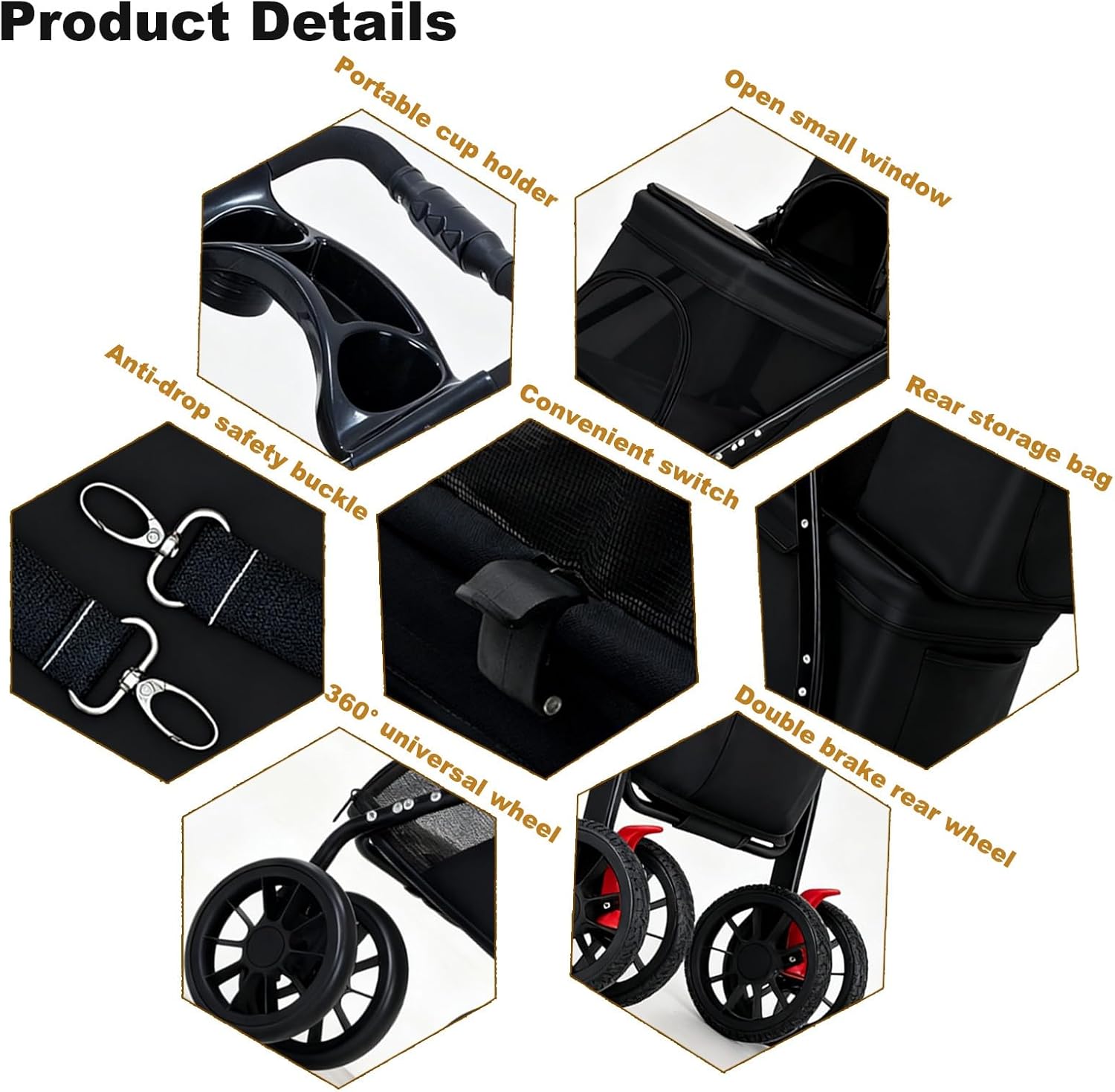 <img alt="Pet cart details" src="https://images-na.ssl-images-amazon.com/images/G/01/x-locale/common/grey-pixel.gif" class="a-spacing-base a-lazy-loaded" data-src="https://m.media-amazon.com/images/S/aplus-media-library-service-media/67071134-fc43-4610-9d5c-5c5408782e83.__CR0,0,970,600_PT0_SX970_V1___.jpg"><img alt="Pet cart details" src="https://m.media-amazon.com/images/S/aplus-media-library-service-media/67071134-fc43-4610-9d5c-5c5408782e83.__CR0,0,970,600_PT0_SX970_V1___.jpg"> <h3 class="a-spacing-mini"> We understand that your pets are part of your family, so we’ve built this stroller with quality and safety as top priorities: </h3> <p class="a-spacing-base"> </p>- Durable & Stable Construction - Made of high-quality metal frame and wear-resistant Oxford cloth, this stroller can withstand daily use and rough terrain without wobbling.- Smooth & Quiet Wheels - Equipped with 360° swivel front wheels and large rear wheels with shock absorption, the stroller glides smoothly on sidewalks, grass, or gravel—no loud noises to scare your pets.- User-Friendly Details - cup holder for your drinks, and a storage pocket for leashes, treats, or your phone. The mesh windows are zippered for easy access and ventilation.- Easy to Clean - The removable and washable padding and waterproof basket liner make cleaning up pet hair, dirt, or accidents a breeze—just wipe or machine wash!