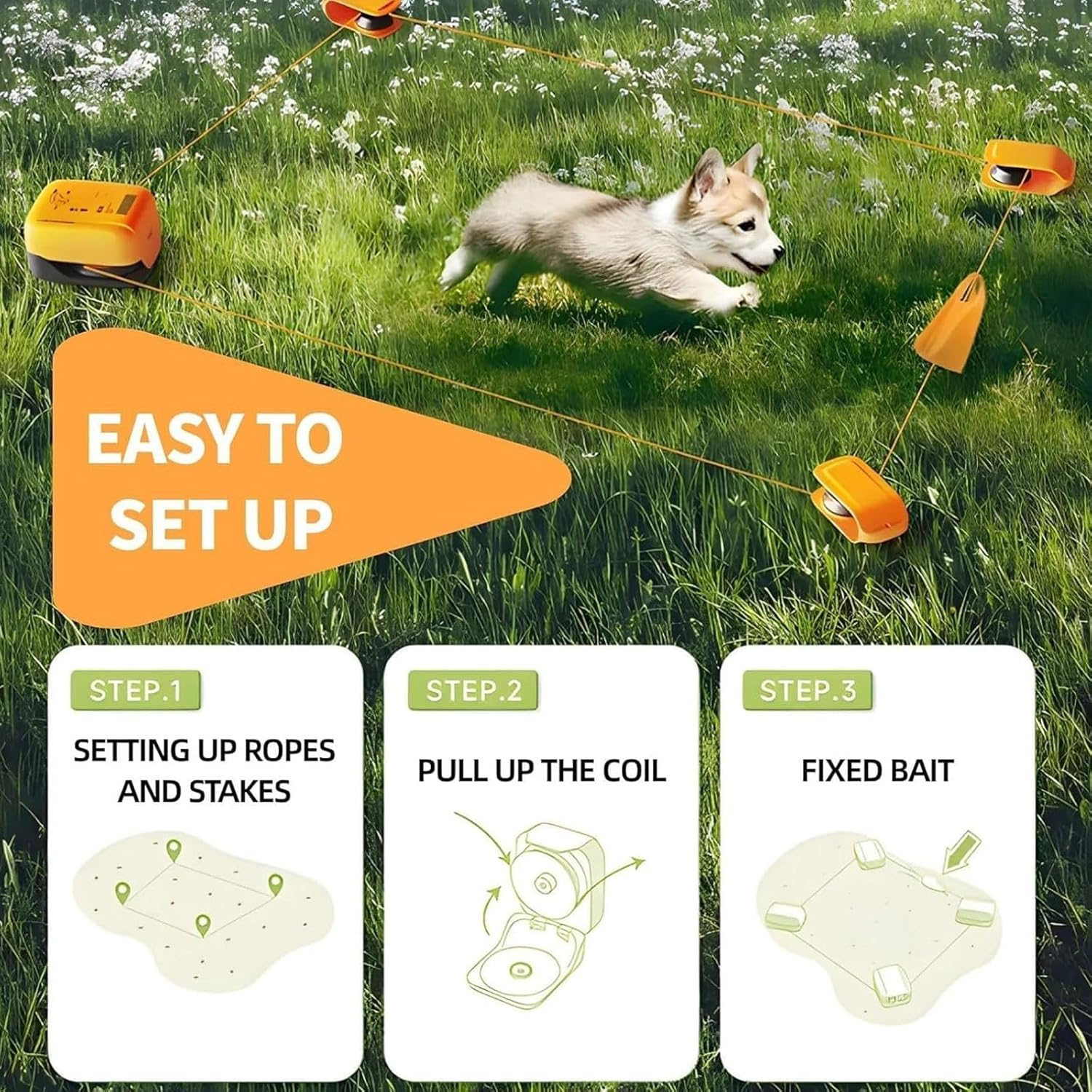 【INSTALLATION AND REMOVAL】3 steps to build dog play: place rope stakes, pull up the coil, fix the bait, and release it while dog running .With the take-up pulley, turn on the main unit, put on the take-up pulley, press the remote control to assist in taking up the linem.