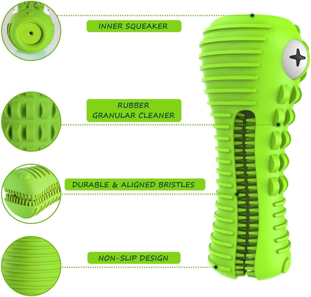 <br> Product Dimensions : 6.3 x 2.4 x 2 inches; 8.4 ounces <br> Item model number : 1 <br> Date First Available : July 7, 2020 <br> Manufacturer : Cutiful <br> ASIN : B08CH37J9C <br> Best Sellers Rank: #4,732 in Pet Supplies (See Top 100 in Pet Supplies) #82 in Dog Chew Toys <br> Customer Reviews: 3.9 3.9 out of 5 stars (5,957) var dpAcrHasRegisteredArcLinkClickAction; P.when('A', 'ready').execute(function(A) { if (dpAcrHasRegisteredArcLinkClickAction !== true) { dpAcrHasRegisteredArcLinkClickAction = true; A.declarative( 'acrLink-click-metrics', 'click', { "allowLinkDefault": true }, function (event) { if (window.ue) { ue.count("acrLinkClickCount", (ue.count("acrLinkClickCount") || 0) + 1); } } ); } }); P.when('A', 'cf').execute(function(A) { A.declarative('acrStarsLink-click-metrics', 'click', { "allowLinkDefault" : true }, function(event){ if(window.ue) { ue.count("acrStarsLinkWithPopoverClickCount", (ue.count("acrStarsLinkWithPopoverClickCount") || 0) + 1); } }); }); <br>Almost indestructible: If you’re worried about durability, don’t be! The gator dog toy is made specifically for aggressive chewers, made of a very resilient rubber, super durable and long lasting. It can provide months of tooth brushing and play.<br>Well-shaped: The dog chew toy is a rather inspired item. It’s molded to have ridges, bumps and bristles, and these shapes fit perfectly into the abstracted gator design. The ergonomic shape makes it easy for the dogs to get a good grip, so dogs love it, It's a great birthday and christmas gift.<br>Clean dog’s teeth: As your dog chews, the bristles and ridges lightly abrade your dog’s teeth, cleaning them in the process. You can even put some dog toothpaste in the mouth area to enhance the cleaning process. The bristles not only make for excellent dog tooth cleaners, but soft treat cradles as well.<br>Attractive dog toy: The dog toy is with a light milk coconut scent. It also has a squeaker inside. It makes an optimal surface for peanut butter or cream cheese, can also house food or toothpaste in the mouth area. It is better for 30-80lbs dog, not for small dog.<br>Easy to clean: To clean the dog chew toy afterward, a special cleaning brush is included. We highly recommend this toy! It’s a great squeaky chew toy, and it helps clean your dog’s teeth, what’s not to love?<br>You will get: 1*grass-green dog chew toy, 1*small cleaning brush