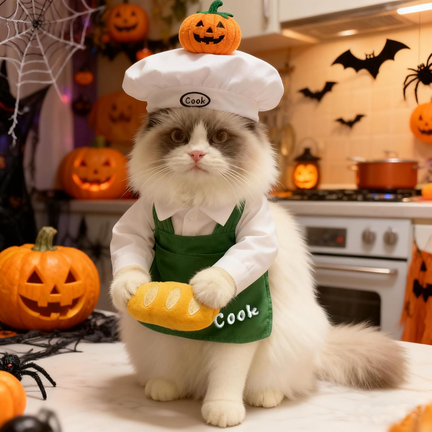<br> Package Dimensions : 11.81 x 10.24 x 2.76 inches; 10.56 ounces <br> Item model number : HPT-038GK-001 <br> Date First Available : November 16, 2025 <br> Manufacturer : HEIPAITE-0028-0M <br> ASIN : B0FXLDSLDK <br> Best Sellers Rank: #124,004 in Pet Supplies (See Top 100 in Pet Supplies) #1,624 in Dog Costumes <br> Customer Reviews: 4.5 4.5 out of 5 stars (2) var dpAcrHasRegisteredArcLinkClickAction; P.when('A', 'ready').execute(function(A) { if (dpAcrHasRegisteredArcLinkClickAction !== true) { dpAcrHasRegisteredArcLinkClickAction = true; A.declarative( 'acrLink-click-metrics', 'click', { "allowLinkDefault": true }, function (event) { if (window.ue) { ue.count("acrLinkClickCount", (ue.count("acrLinkClickCount") || 0) + 1); } } ); } }); P.when('A', 'cf').execute(function(A) { A.declarative('acrStarsLink-click-metrics', 'click', { "allowLinkDefault" : true }, function(event){ if(window.ue) { ue.count("acrStarsLinkWithPopoverClickCount", (ue.count("acrStarsLinkWithPopoverClickCount") || 0) + 1); } }); }); <br>【Adorable Chef Design】Transform your pup into a charming chef with this pet cosplay outfit, featuring a chef hat, a green apron and a plush bread prop for a full standing look.Perfect for Halloween, parties, Christmas, New Year, Thanksgiving or just adding some fun.<br>【Multiple Sizes Available】Choose from sizes B1 to B5 to fit dogs or cats of different weights (3 - 99 lbs). Refer to the size chart for chest (33 - 108 CM), neck (28 - 69 CM), and front length (15.5 - 51 CM) measurements. Fit on cats and small, medium or large dogs.<br>【Comfortable to Wear】Made with soft polyester materials, this cat puppy costume ensures your dog stays comfortable while looking cute. The design allows for easy movement, so your pet can play and walk without restrictions.<br>【Great for Photo Opportunities】Capture precious moments of your dog or cat dressed as a chef. The vivid design and props make for eye-catching photos that you can share with family and friends.<br>【Durable and Well-Made】Crafted with quality materials, this pet costume is built to last. It can withstand your dog’s activities and multiple uses, providing long-lasting fun.