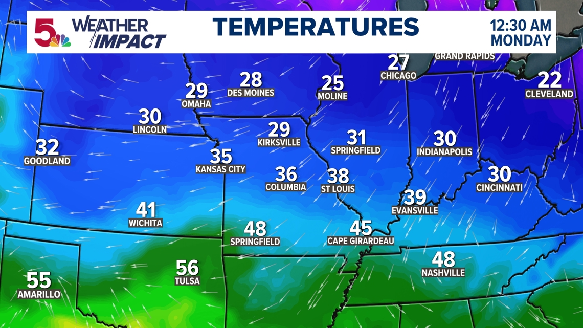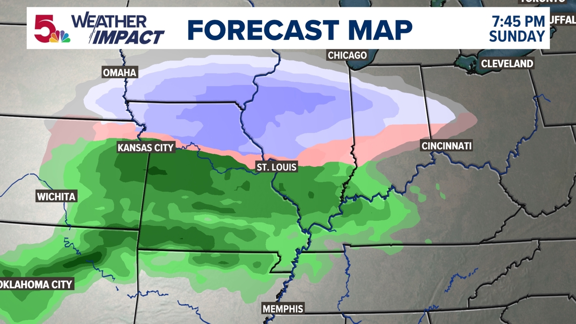 If you have Sunday night plans or a Monday morning commute, have a Plan A/Plan B mindset. The “rain/snow line” near St. Louis is why we’re emphasizing staying tuned: as new data comes in, we’ll fine-tune timing of the changeover, how far south the snow line gets and whether the metro’s biggest threat is brief slick spots or something more widespread. Right now, the odds of travels impacts appear to be limited to mostly roads being wet.