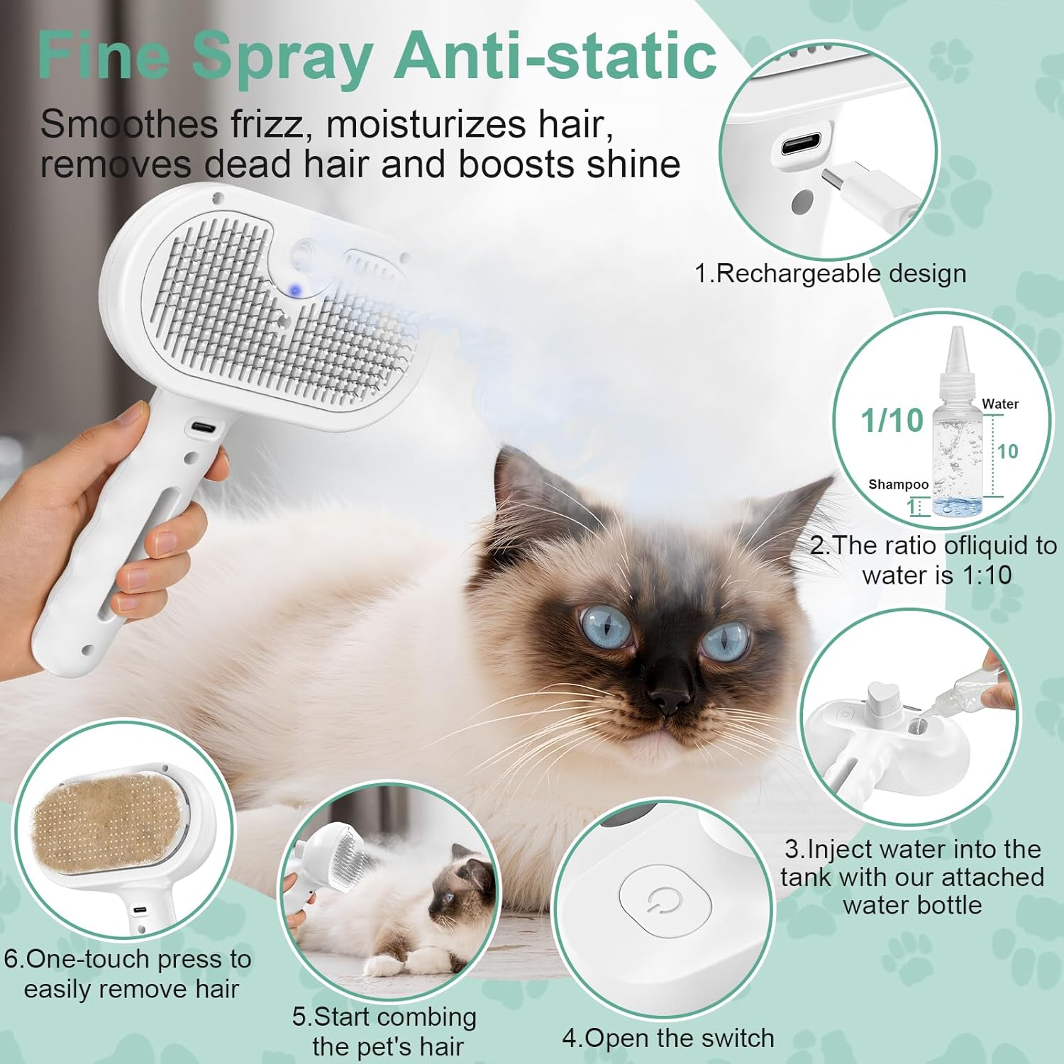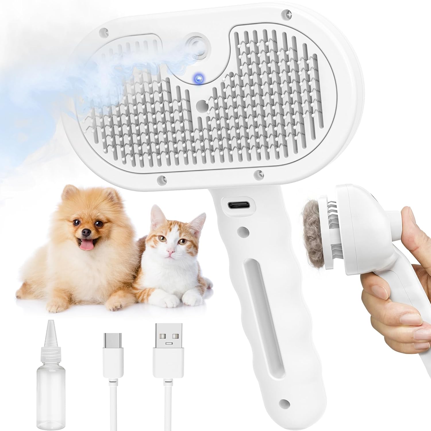 <br> Product Dimensions : 8.26 x 4.7 x 2.95 inches; 7.84 ounces <br> Manufacturer : Viphope <br> ASIN : B0FX3LWYY6 <br> Best Sellers Rank: #43,558 in Pet Supplies (See Top 100 in Pet Supplies) #101 in Cat Brushes <br> Customer Reviews: 4.4 4.4 out of 5 stars (21) var dpAcrHasRegisteredArcLinkClickAction; P.when('A', 'ready').execute(function(A) { if (dpAcrHasRegisteredArcLinkClickAction !== true) { dpAcrHasRegisteredArcLinkClickAction = true; A.declarative( 'acrLink-click-metrics', 'click', { "allowLinkDefault": true }, function (event) { if (window.ue) { ue.count("acrLinkClickCount", (ue.count("acrLinkClickCount") || 0) + 1); } } ); } }); P.when('A', 'cf').execute(function(A) { A.declarative('acrStarsLink-click-metrics', 'click', { "allowLinkDefault" : true }, function(event){ if(window.ue) { ue.count("acrStarsLinkWithPopoverClickCount", (ue.count("acrStarsLinkWithPopoverClickCount") || 0) + 1); } }); }); <br>【Multifunctional Dog Cat Steam Brush】: This multi-functional pet steam brush that combines the functions of hair removal, cleaning and massage. It effectively removes loose fur from your dog or cat,reducing tangles and matting while keeping their coat smooth and soft. Let you easily take care of your beloved pets every day.<br>【One-Click Self-Cleaning Design】: This pet grooming tool features a one-touch hair removal button. After pet shedding, press the button to easily remove fur from the bristles, keeping the brush clean and minimizing flying fur. Note: This product is not waterproof, Do not rinse the brush.<br>【Professional-level Pet Brush】:This hair brush with steam delivering even and fine steam that reduces static and flying fur, centrally positioned steam holes, it ensures uniform pre-moistening pet hair. giving the pet a comfortable experience. The visual area of the water tank allows you to check the capacity and add more at any time.Please use the included empty bottle to refilling with water or other liquids in the form of water.<br>【Durable and Comfortable Cat Brush】This cat steam brush are made of high-quality ABS plastic for the casing, Stainless steel for the bristles, each comb tooth tip is designed with a round massage point,won't harm your pet's skin, removes loose hair while providing a comfortable massage experience.<br>【Easy to Use】This dog steam brush is suitable for all long-haired and short-haired pets, the teeth of the comb are deep enough to fit your pet's hair perfectly. A full charge takes 2-3 hours, provides up to a week of use. Its compact size and lightweight design make it easy to carry and store, making it ideal for daily grooming needs, allowing you to provide your pet with a professional-grade experience anytime, anywhere.