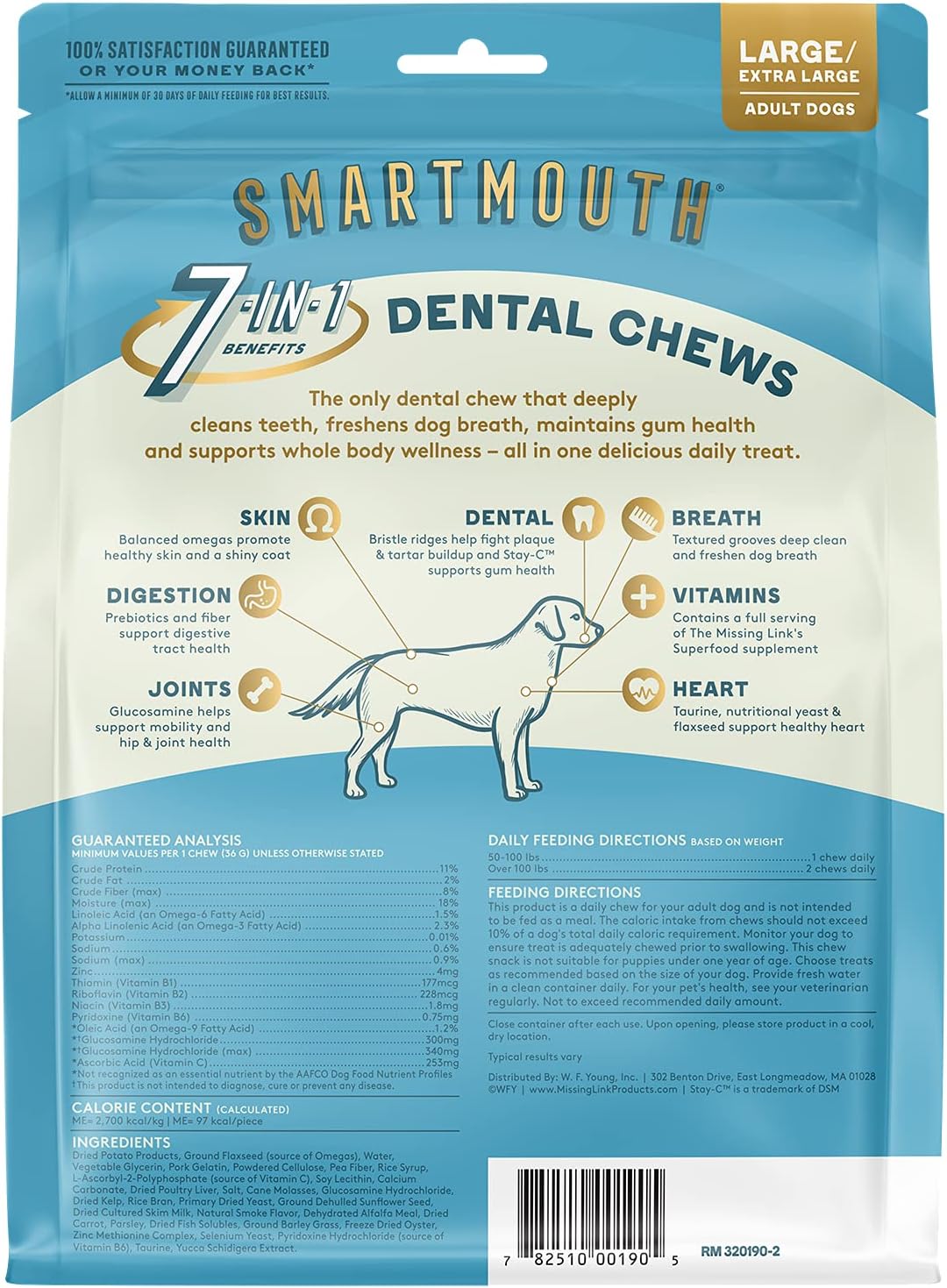 <br> Product Dimensions : 8.5 x 3.9 x 11 inches; 2.2 Pounds <br> Item model number : 400190 <br> Date First Available : May 23, 2019 <br> Manufacturer : THE MISSING LINK NWS <br> ASIN : B07S84QKPJ <br> Best Sellers Rank: #15,931 in Pet Supplies (See Top 100 in Pet Supplies) #946 in Dog Treat Cookies, Biscuits & Snacks <br> Customer Reviews: 4.4 4.4 out of 5 stars (267) var dpAcrHasRegisteredArcLinkClickAction; P.when('A', 'ready').execute(function(A) { if (dpAcrHasRegisteredArcLinkClickAction !== true) { dpAcrHasRegisteredArcLinkClickAction = true; A.declarative( 'acrLink-click-metrics', 'click', { "allowLinkDefault": true }, function (event) { if (window.ue) { ue.count("acrLinkClickCount", (ue.count("acrLinkClickCount") || 0) + 1); } } ); } }); P.when('A', 'cf').execute(function(A) { A.declarative('acrStarsLink-click-metrics', 'click', { "allowLinkDefault" : true }, function(event){ if(window.ue) { ue.count("acrStarsLinkWithPopoverClickCount", (ue.count("acrStarsLinkWithPopoverClickCount") || 0) + 1); } }); }); <br>REDUCES TARTAR & FRESHENS BREATH - Unique bristle ridges and Stay-C (a patented form of Vitamin C) help fight plaque & tartar buildup while deep cleaning teeth for fresh breath<br>7-IN-1 BENEFITS - A single chew provides daily vitamins for whole body health support of teeth & gums, breath, joints, skin, digestion, heart & immune system<br>VETERINARIAN DEVELOPED FOR COMPLETE HEALTH - An easy, fun to feed treat that combines glucosamine, balanced omegas, flaxseed & more for a happier & healthier life<br>ONLY THE GOOD STUFF - NON-GMO, gluten-free, and no artificial colors or flavors<br>DELICIOUS DAILY TREATS - Made in the USA & backed 100% by manufacturer guarantee