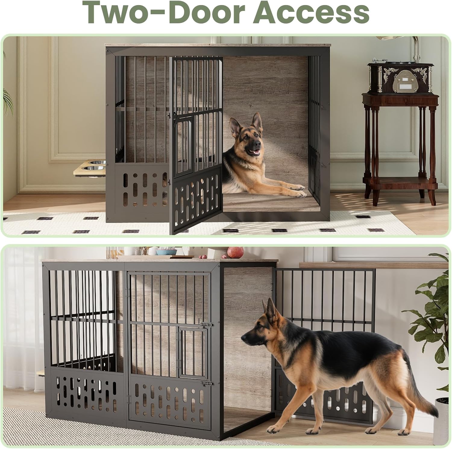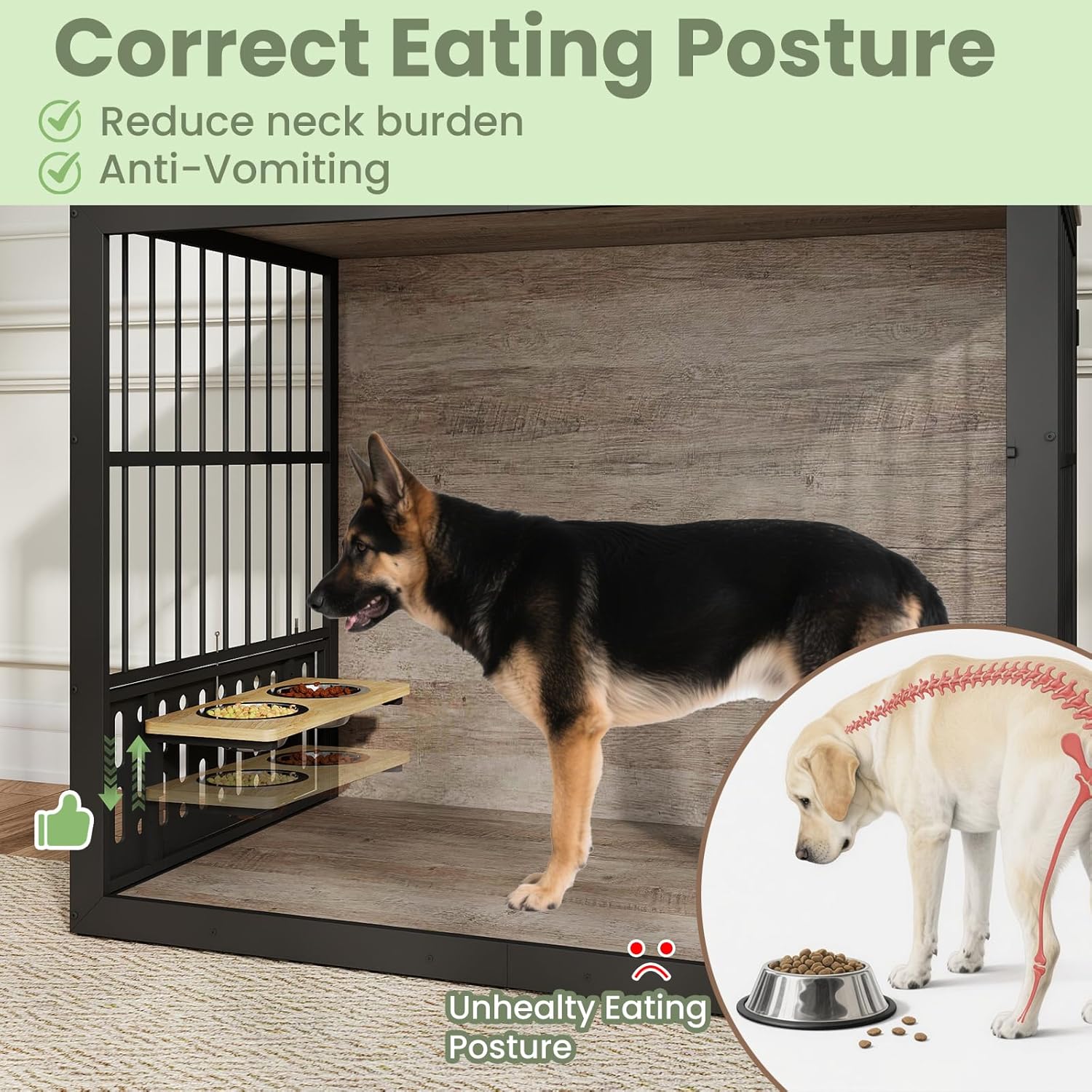 【360° Rotating Feeder】The xxl dog crate furniture gets a 360° rotating feeder for convenient feeding and interaction with your furry friend. Stable dog bowl stand with 2 stainless steel dog bowls can be adjusted to 5 heights, promoting dogs’ healthy digestion and great for their cervical spine
