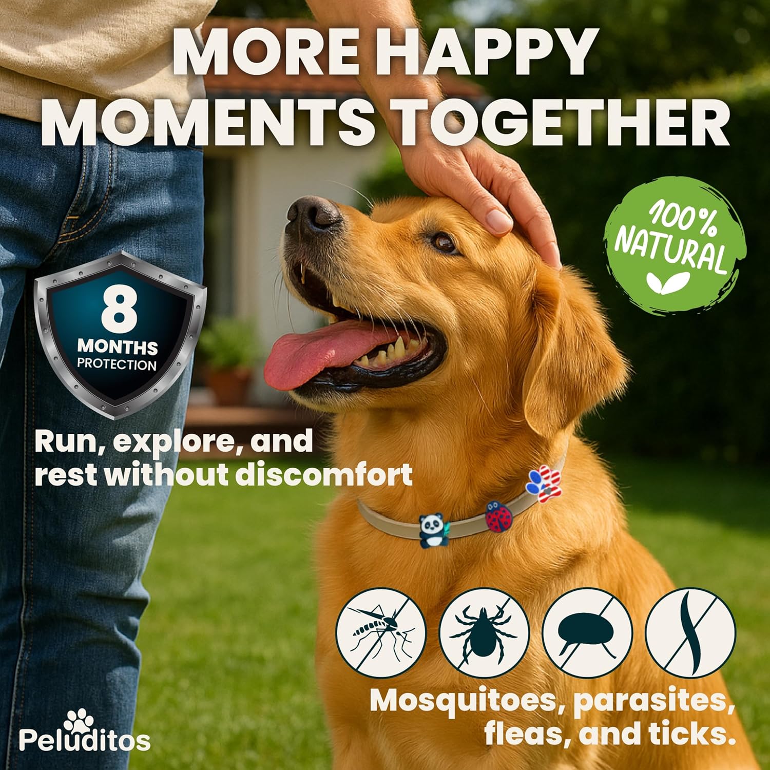 <img alt="Grupo de mascotas de diferentes tamaños para que se vea que el collar vale para cualquiera tamaño" src="https://images-na.ssl-images-amazon.com/images/G/01/x-locale/common/grey-pixel.gif" class="a-spacing-base a-lazy-loaded" data-src="https://m.media-amazon.com/images/S/aplus-media-library-service-media/cc9bf4b5-3868-47f9-9765-7d359d936f1b.__CR0,0,2021,1250_PT0_SX970_V1___.jpg"><img alt="Grupo de mascotas de diferentes tamaños para que se vea que el collar vale para cualquiera tamaño" src="https://m.media-amazon.com/images/S/aplus-media-library-service-media/cc9bf4b5-3868-47f9-9765-7d359d936f1b.__CR0,0,2021,1250_PT0_SX970_V1___.jpg"> <h3 class="a-spacing-mini"> Product Details & Care </h3> <p class="a-spacing-base"> </p>Length: adjustable – fits dogs of all sizes.Material: polymer + essential oils.Included: 2 comfortable collar for dogs + 3 decorative charms.For external use only.Store in a cool, dry place.Non-pesticidal pet accessory. Contains no active ingredients intended to kill or repel pests.