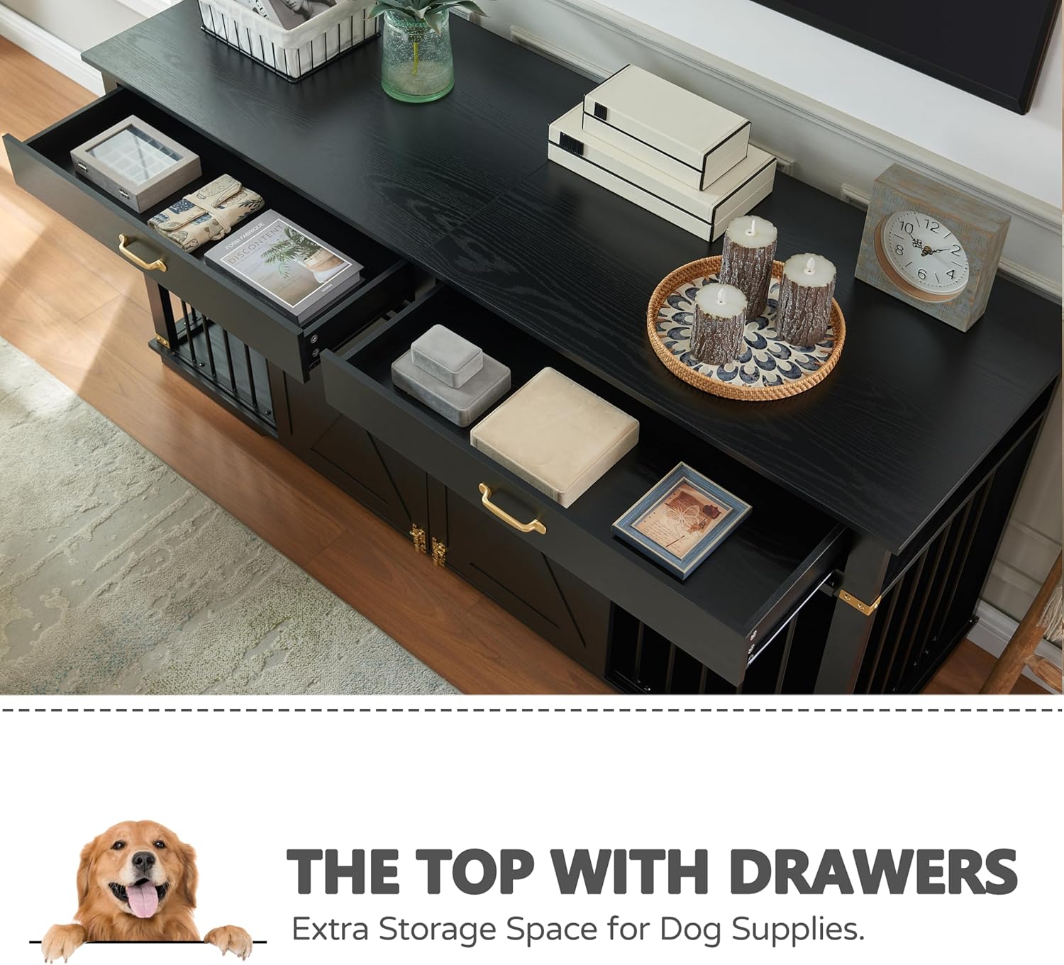 <br> Product Dimensions : 72.5 x 23.6 x 34.3 inches; 124.3 Pounds <br> Item model number : ED-WMDC04-BLK <br> Date First Available : January 23, 2026 <br> Manufacturer : Edyo Living <br> ASIN : B0GJCJPGPW <br> Best Sellers Rank: #59,027 in Pet Supplies (See Top 100 in Pet Supplies) #155 in Furniture-Style Dog Crates <br> Customer Reviews: 3.9 3.9 out of 5 stars (119) var dpAcrHasRegisteredArcLinkClickAction; P.when('A', 'ready').execute(function(A) { if (dpAcrHasRegisteredArcLinkClickAction !== true) { dpAcrHasRegisteredArcLinkClickAction = true; A.declarative( 'acrLink-click-metrics', 'click', { "allowLinkDefault": true }, function (event) { if (window.ue) { ue.count("acrLinkClickCount", (ue.count("acrLinkClickCount") || 0) + 1); } } ); } }); P.when('A', 'cf').execute(function(A) { A.declarative('acrStarsLink-click-metrics', 'click', { "allowLinkDefault" : true }, function(event){ if(window.ue) { ue.count("acrStarsLinkWithPopoverClickCount", (ue.count("acrStarsLinkWithPopoverClickCount") || 0) + 1); } }); }); <br>Farmhouse Style Double Dog Crate: Overall Size: 72.5"L x 23.6"W x 34.3"H. Classic barn doors + rustic bracket decor blend modern casual & farmhouse charm, seamlessly matching your home furniture—no bulky "pet crate" look<br>Water-Resistant Anti-Soak BaseD: Built-in water-resistant baseboards with anti-soak technology. Spilled liquids won’t seep into the wood; a quick wipe is all it takes for a clean, dry crate—low maintenance for daily pet life<br>Sturdy Chew-Resistant Build: Crafted from high-quality wood + thickened iron pipes for unshakable sturdiness. Chew-resistant design stands up to scratching/gnawing, ensuring long-lasting use for medium/large dogs<br>Removable Divider: Flexible divider customizes the crate at will: install for 2 private rooms or remove for one big open space—adapts to all your pets’ living needs<br>Multi-Purpose Furniture & Cozy Pet Den: Dual-function design: works as a stylish dog kennel and useful home furniture (TV stand, storage cabinet, entryway console). Built-in drawers store pet toys/treats; cabinet-style design creates a secure, cozy space that satisfies pets’ exploration instinct and boosts their sense of safety